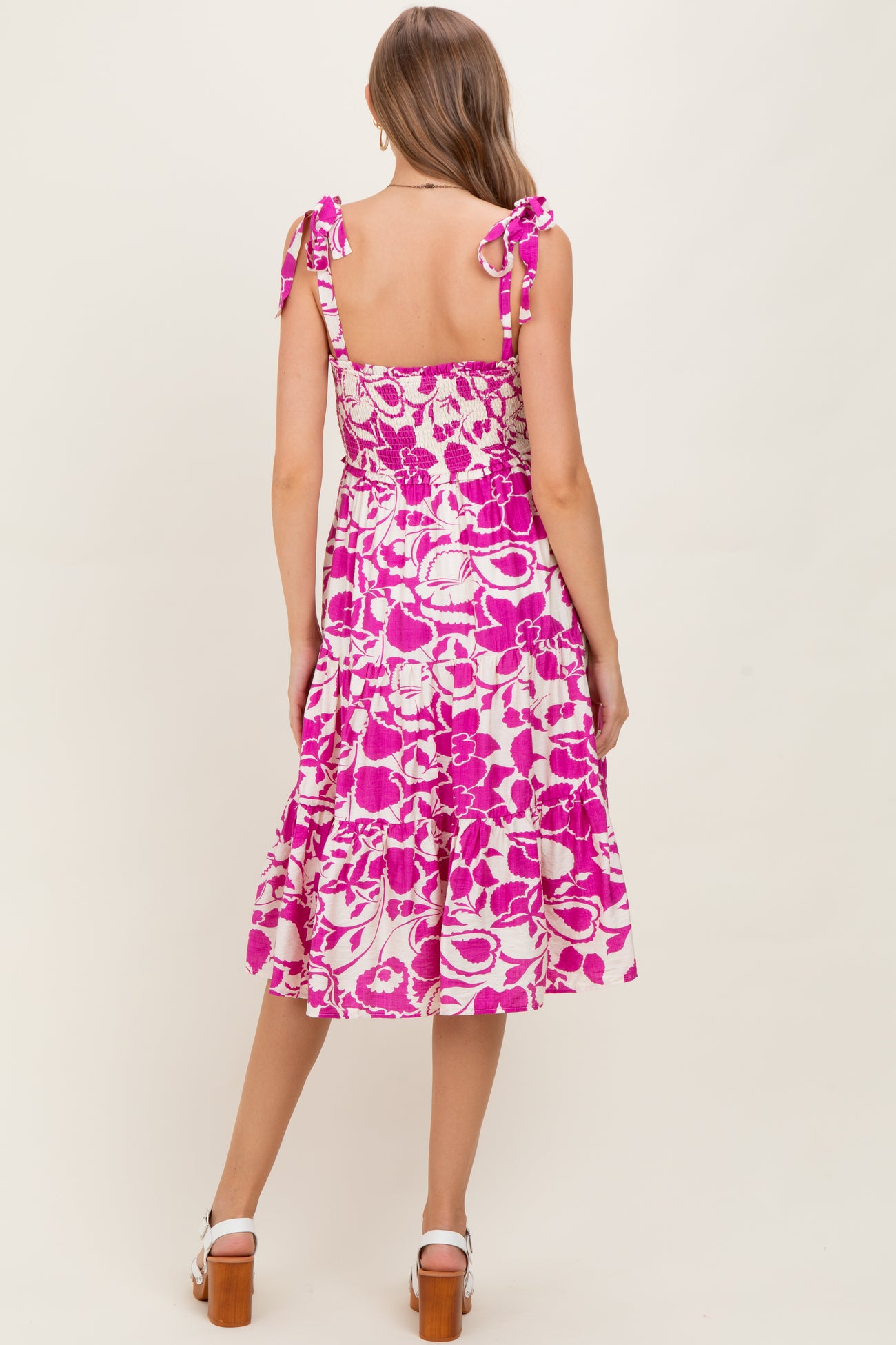 Fuchsia Bloom Floral Print Tie Strap Smocked Tiered Maternity Dress