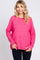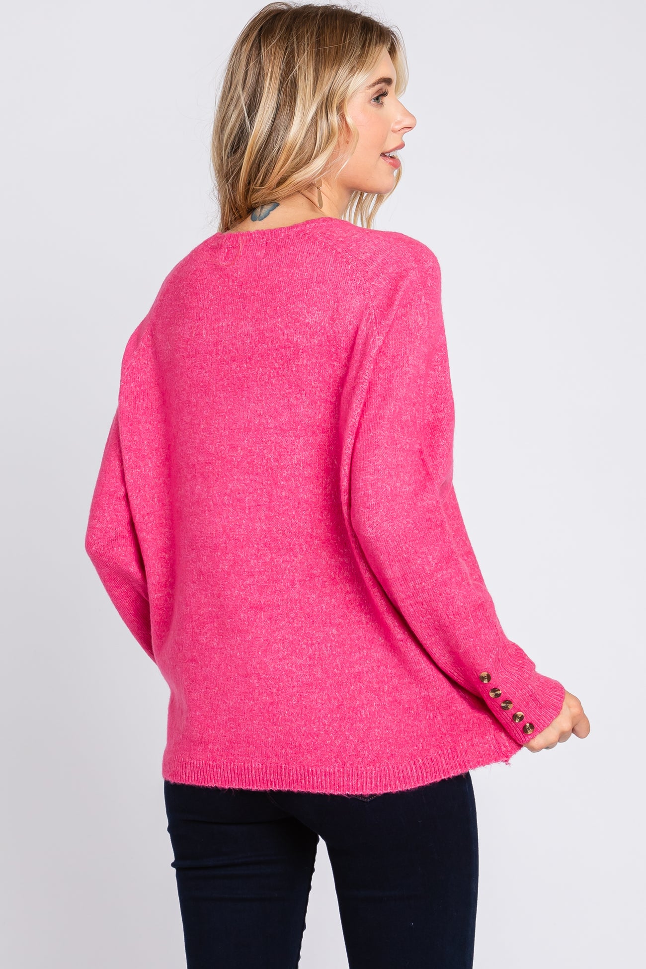 A sweater with a ribbed rounded neckline, a ribbed hem, and long sleeves with button accents.