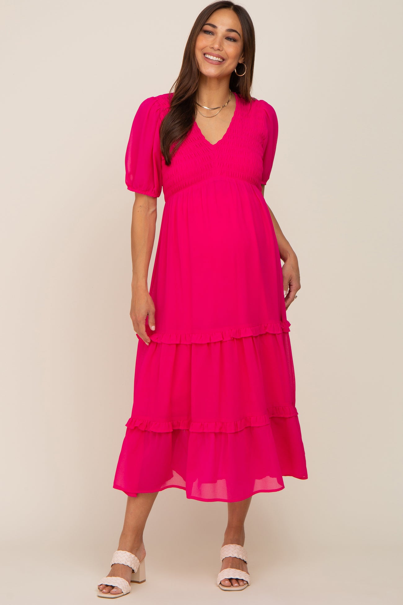 Fuchsia Chiffon Smocked V-Neck Ruffle Tiered Maternity Midi Dress