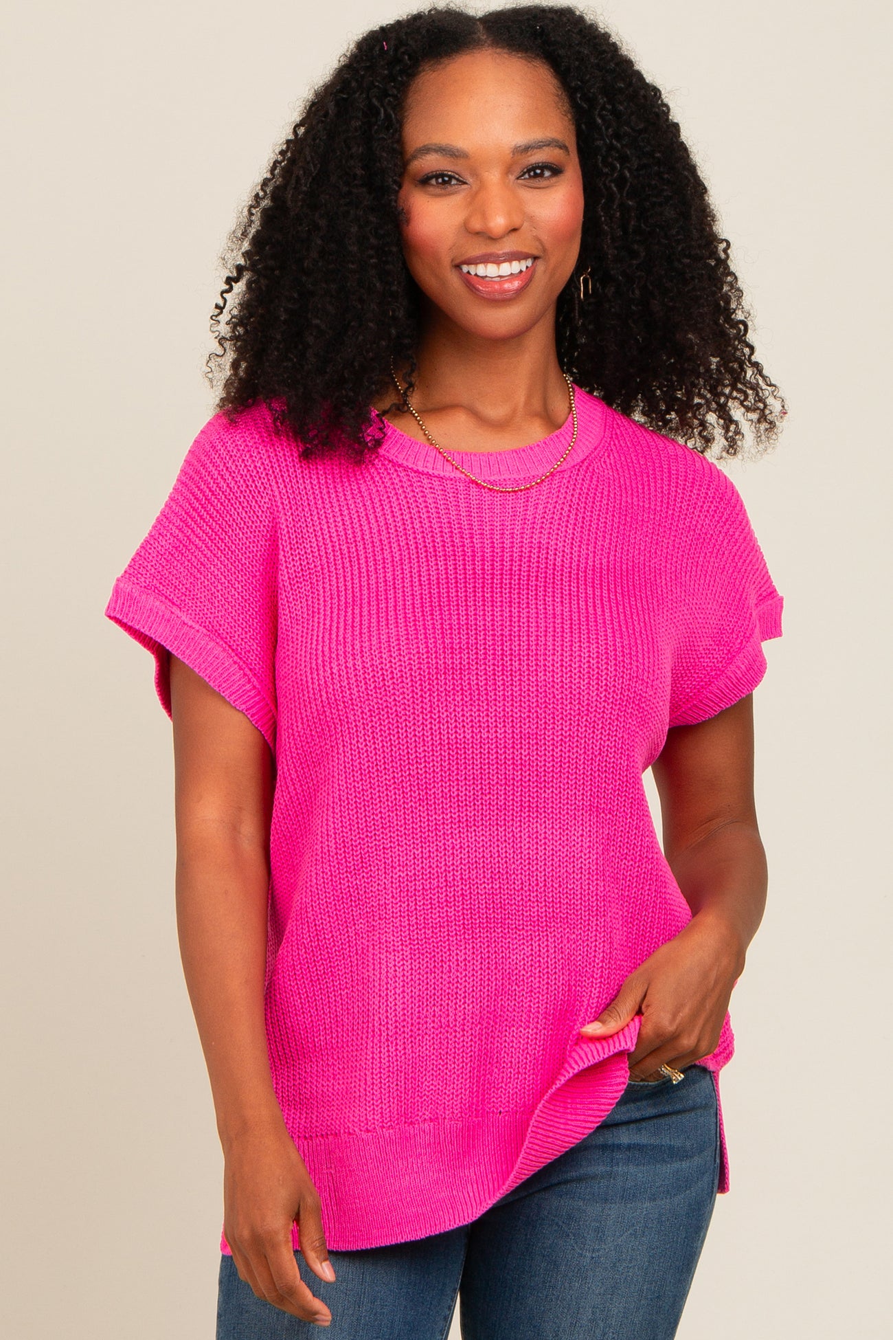 Fuchsia Dolman Short Sleeve Side Slit Sweater Top
