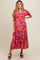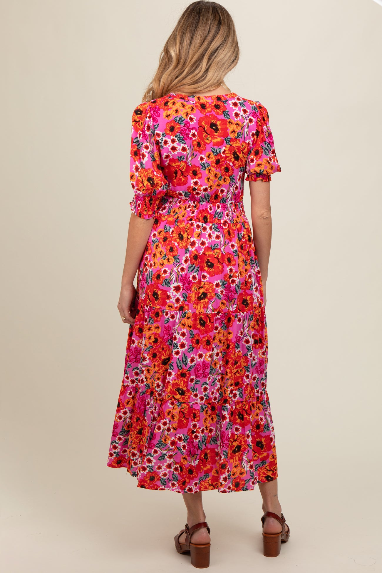 Fuchsia Floral Button Front Smocked Waist Tiered Maternity Midi Dress