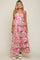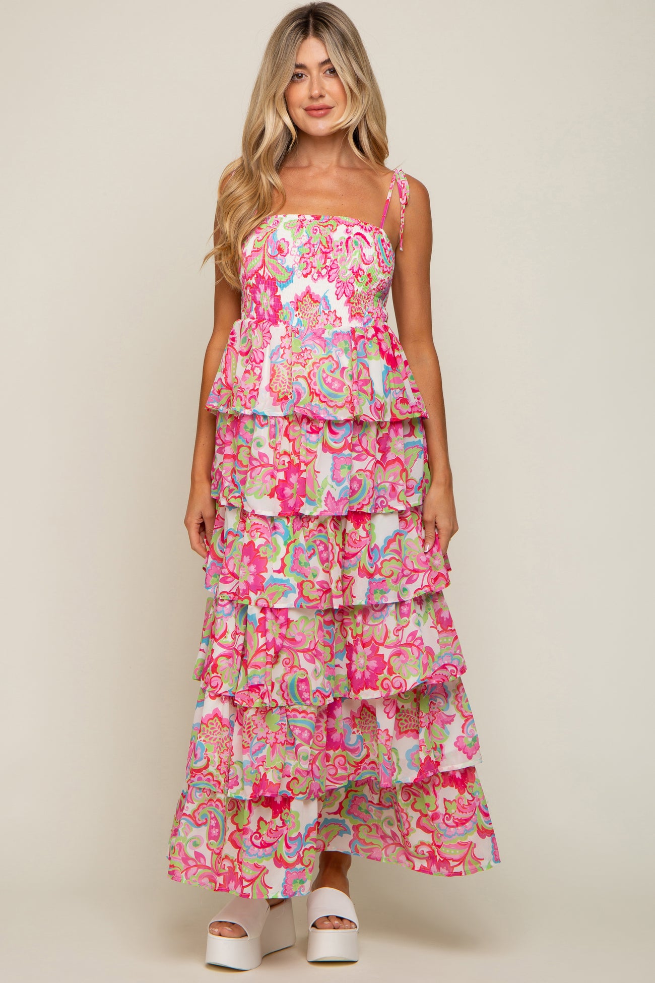 Fuchsia Floral Chiffon Smocked Shoulder Tie Ruffle Tiered Maternity Maxi Dress