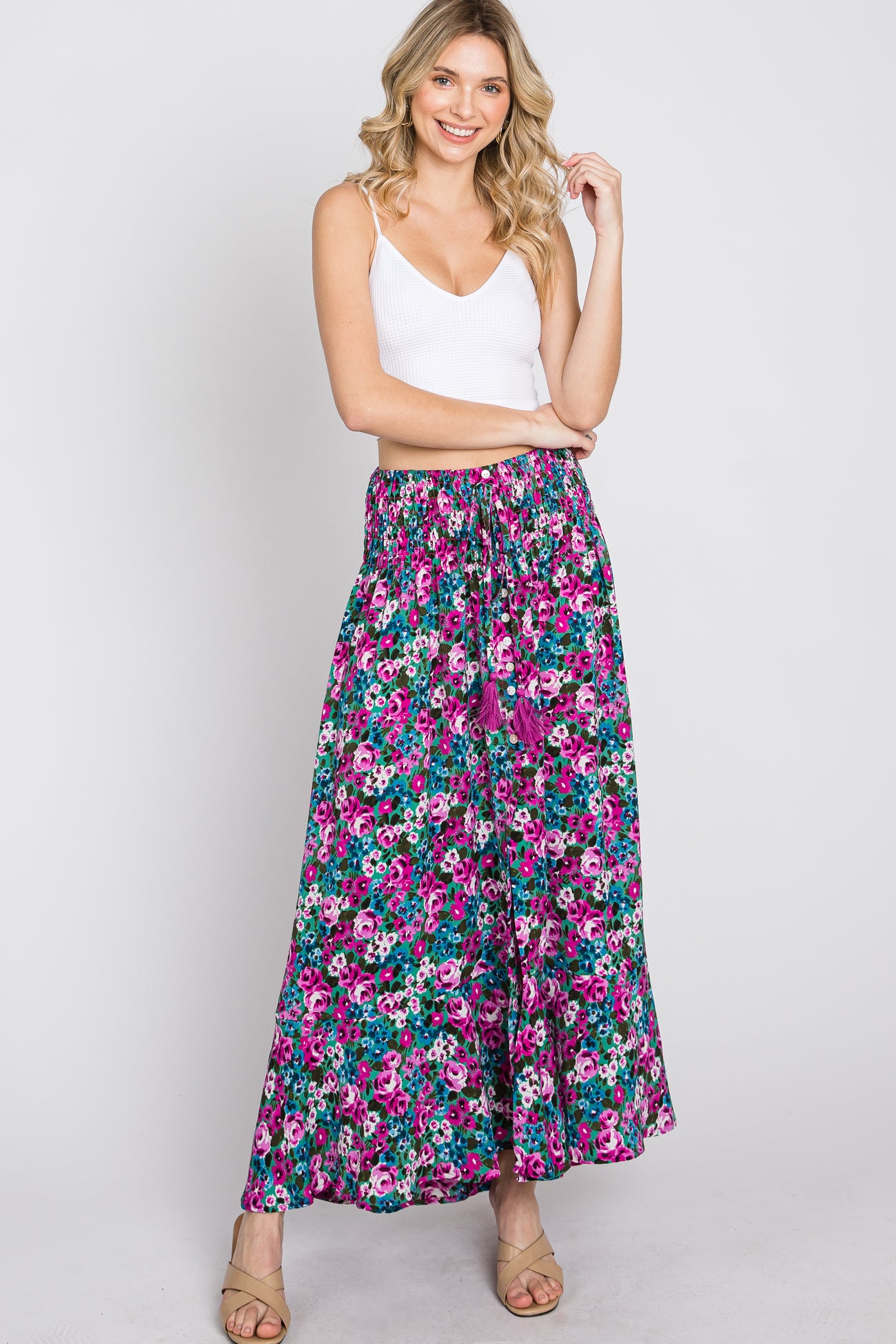 Details A floral skirt featuring a hi-low flounce hemline, a smocked elastic waistline, and a front tie. Content + Care