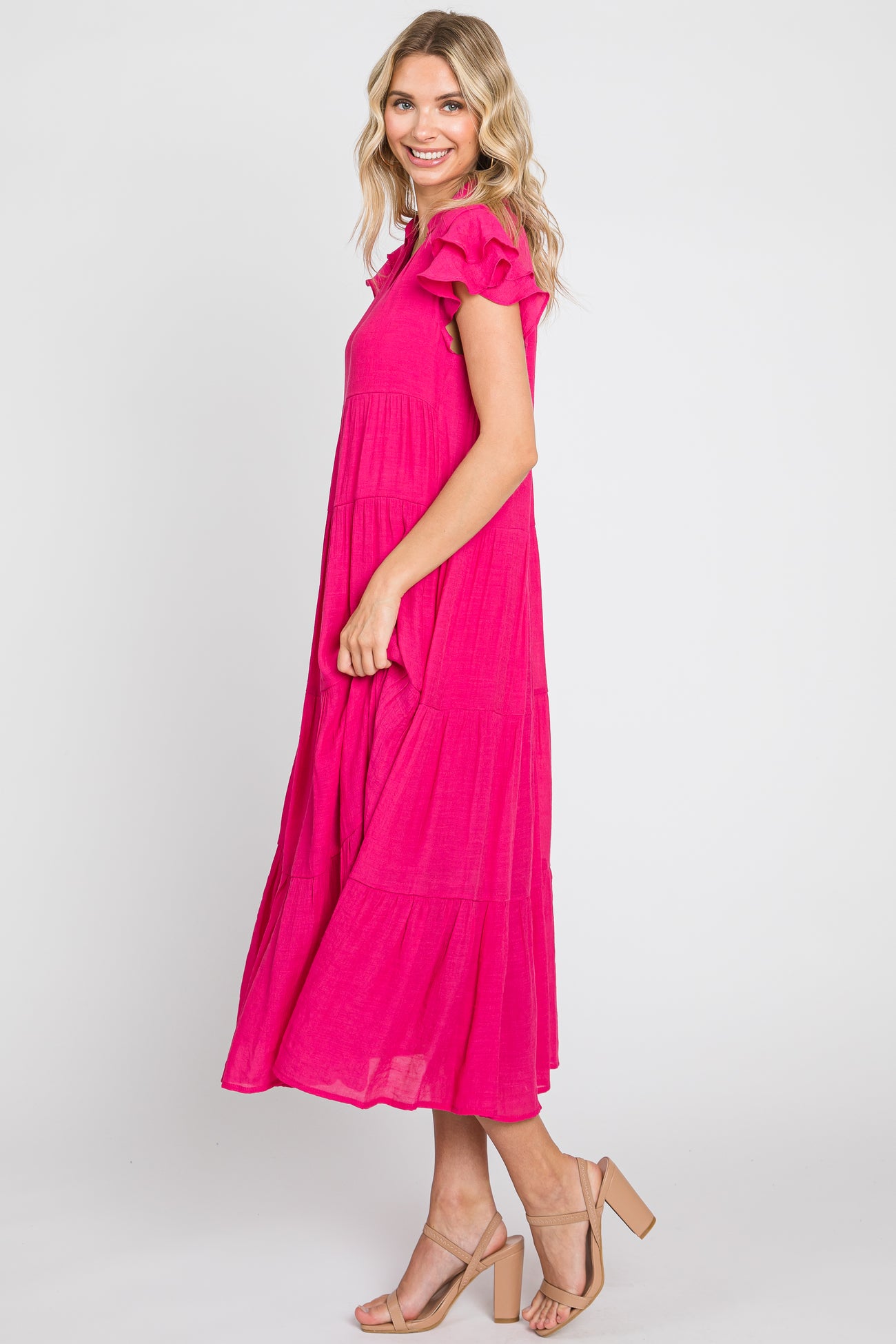 Fuchsia Flutter Sleeve Tiered Midi Dress