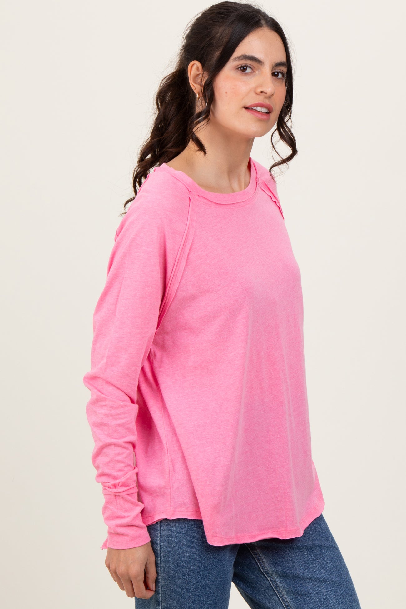 Elevate your casual wardrobe with this long sleeve top featuring distinctive exposed seam detailing for a modern, effortless look. Crafted from a soft, lightweight fabric, it offers all-day comfort and breathability. The relaxed fit and slightly longer back hem provide a flattering silhouette while ensuring ease of movement. Perfect for layering or wearing solo, this versatile top pairs seamlessly with jeans or leggings for an easygoing yet stylish outfit. Upgrade your essentials with this cozy, chic piece designed for everyday wear.
