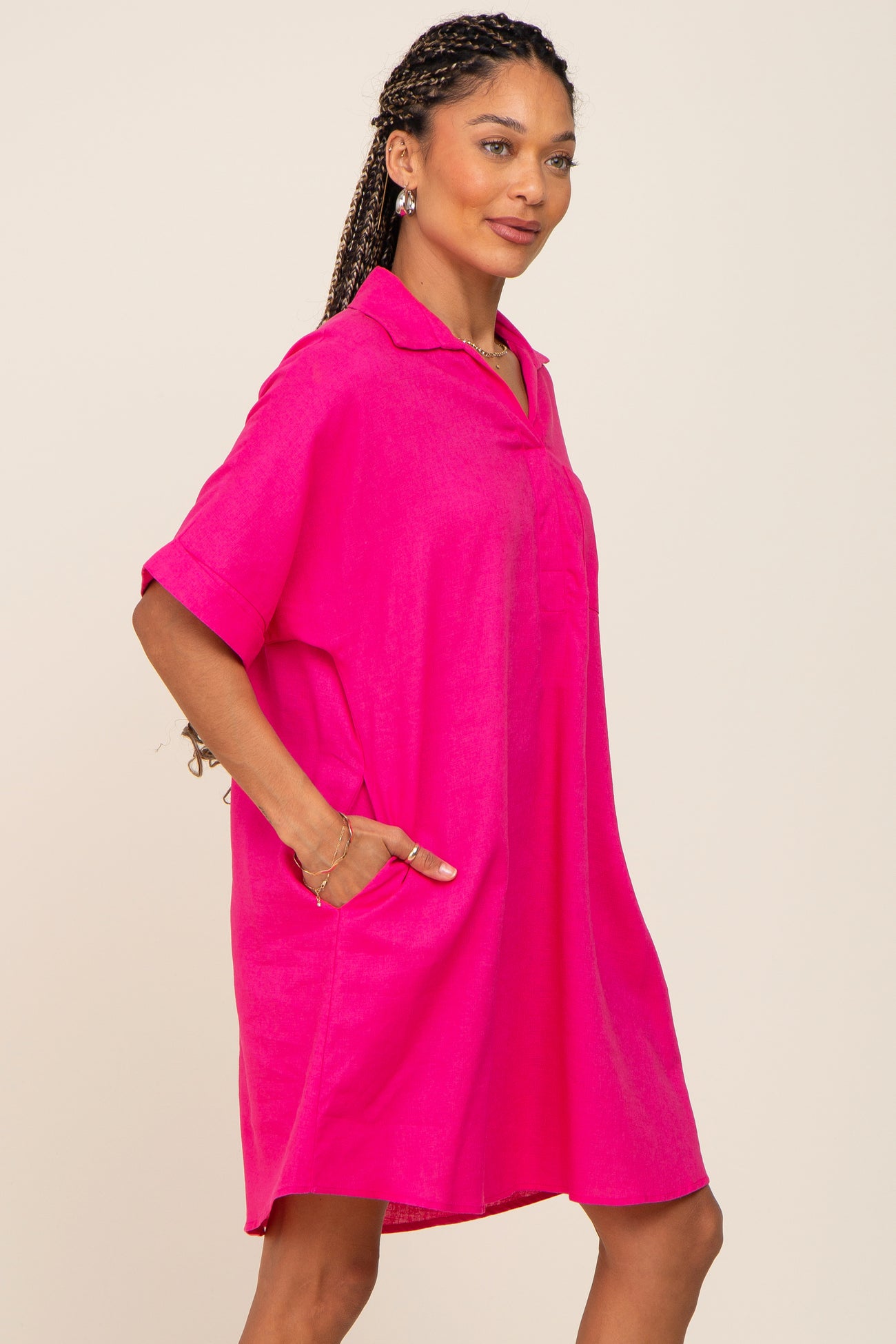 Fuchsia Linen Collared Front Pocket Short Sleeve Dress