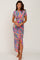 A multi-color floral maxi dress featuring short sleeves, side ruching, a side slit and a rounded neckline.