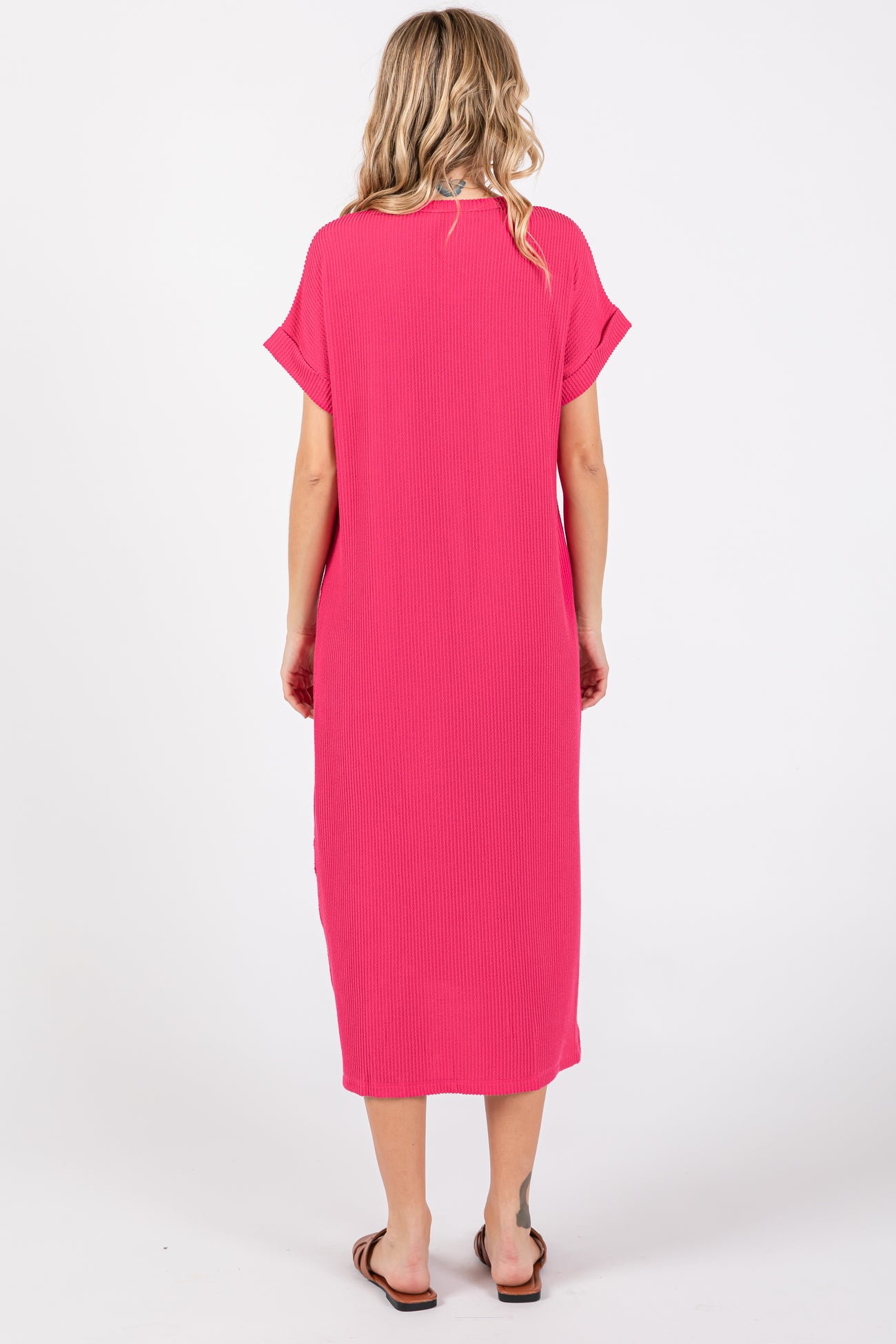 Fuchsia Ribbed Short Sleeve Midi Dress