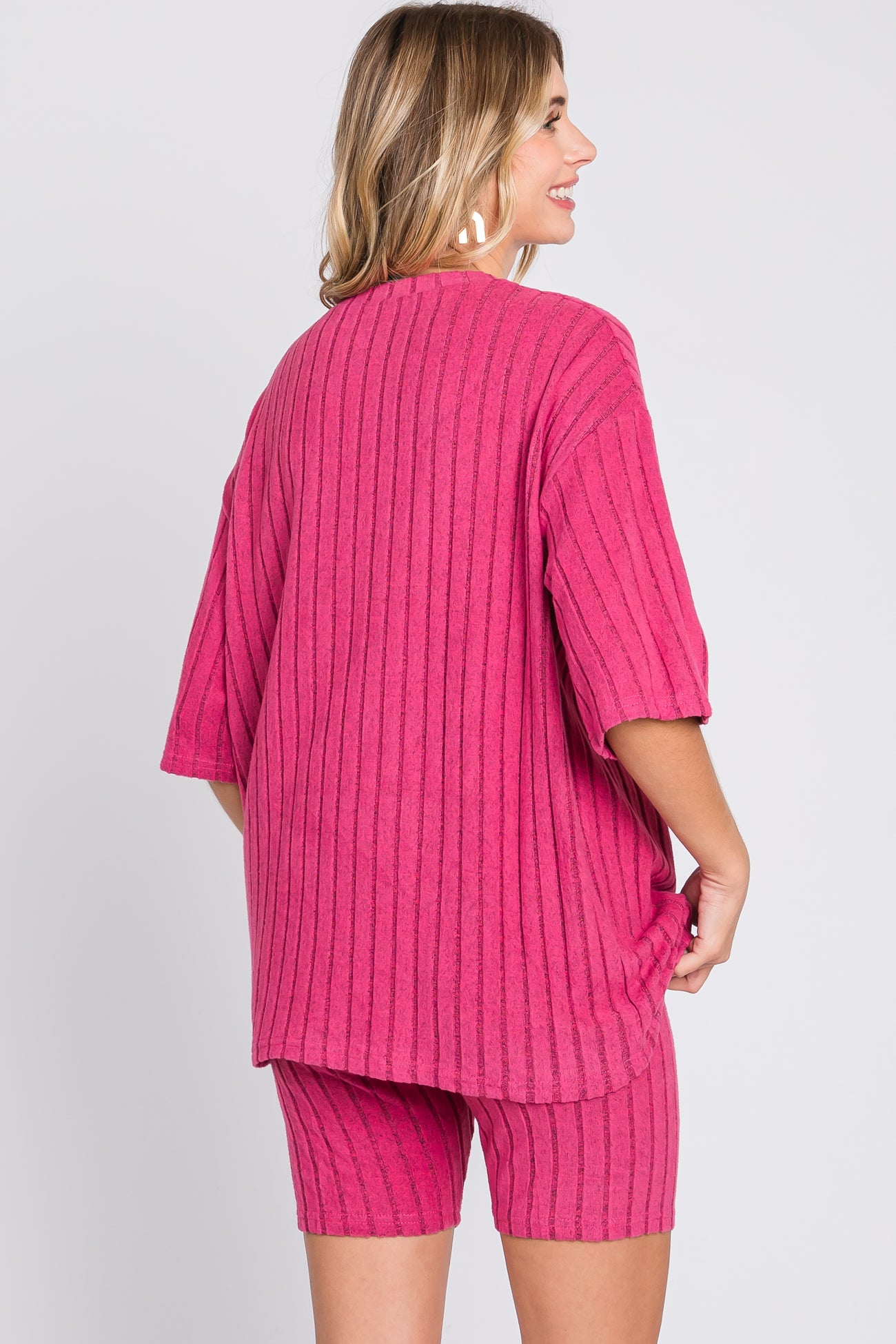 Fuchsia Ribbed Soft Short Sleeve Shorts Set