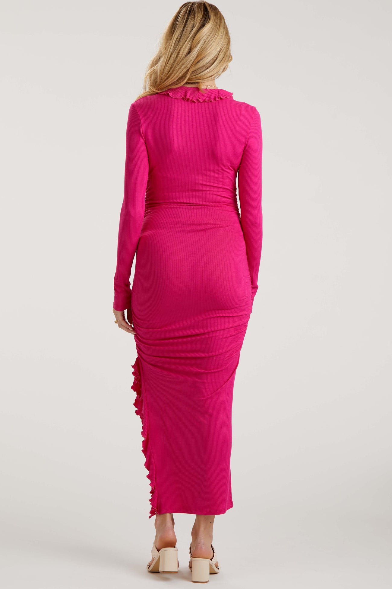 Fuchsia Ruffle Ruched Long Sleeve Maternity Maxi Dress