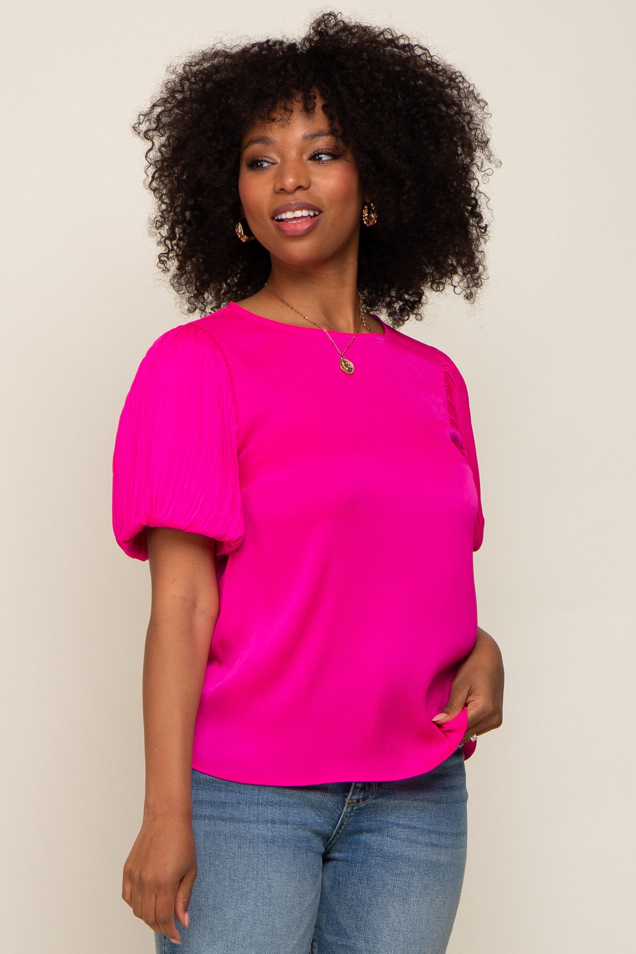 Fuchsia Satin Pleated Puff Short Sleeve Maternity Blouse
