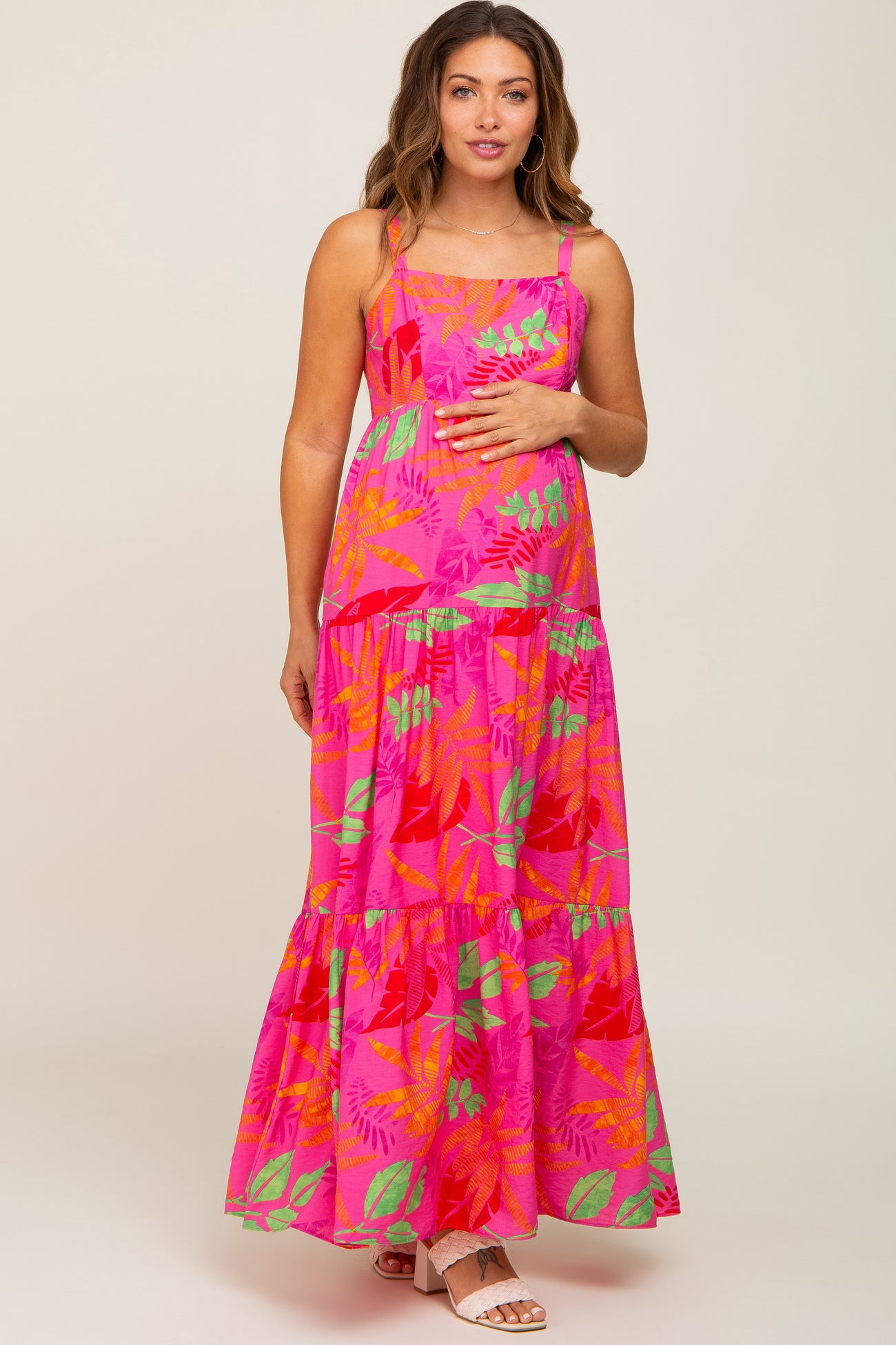 Fuchsia Tropical Leaf Print Maternity Maxi Dress