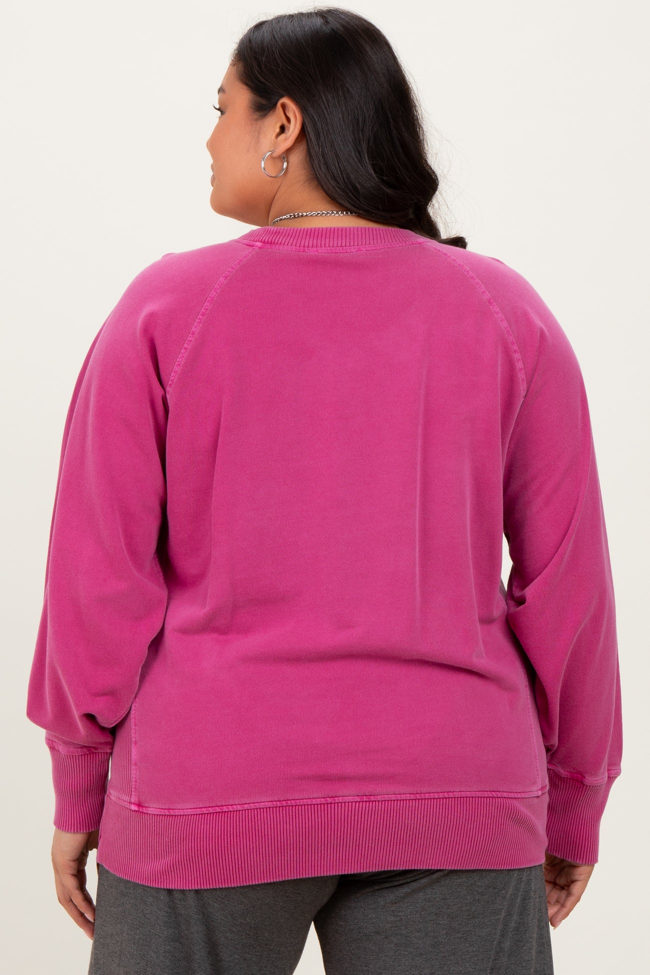Embrace cozy style with our Fuchsia Vintage Wash French Terry Plus Pullover. This soft, breathable sweatshirt features a relaxed fit with vintage wash for a trendy, worn-in look. Designed with ribbed cuffs, hem, and neck detailing for added comfort and durability. Perfect for layering or wearing on its own, it pairs effortlessly with your favorite lounge pants or jeans. Whether you're running errands or relaxing at home, this pullover offers comfort and style in every curve. Available in plus sizes to celebrate every body. Upgrade your casual wardrobe with this must-have cozy pullover!
