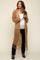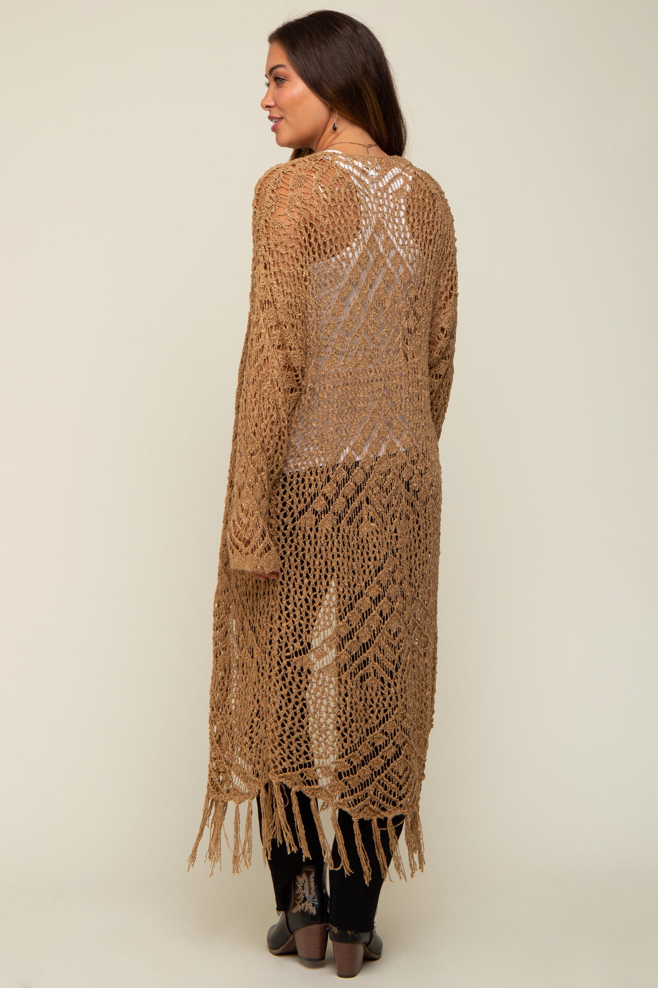 A crochet knit long maternity cardigan featuring long sleeves, an open front and crochet trim.