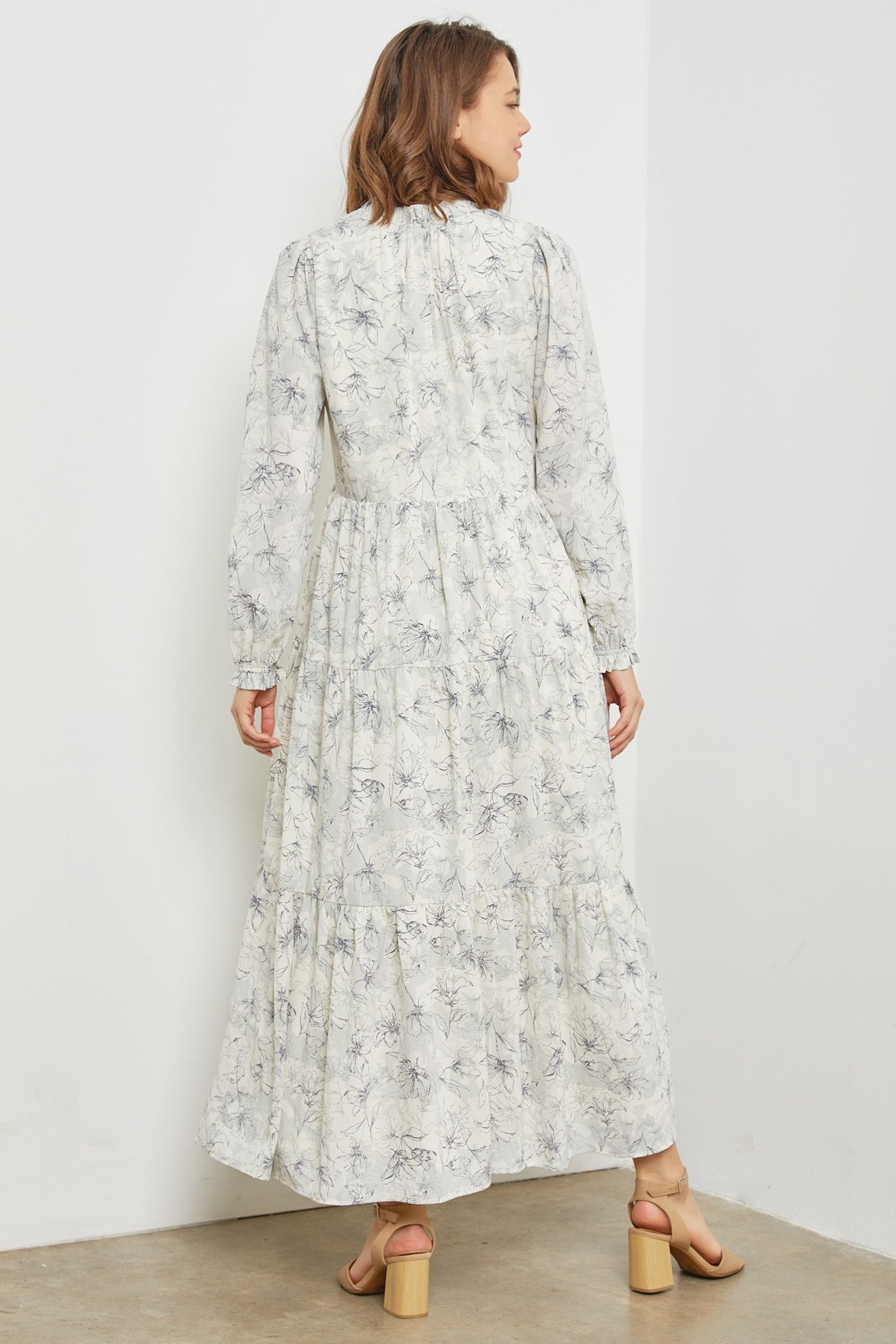 Gray Floral Tassel Tiered Long Sleeve Maxi Dress