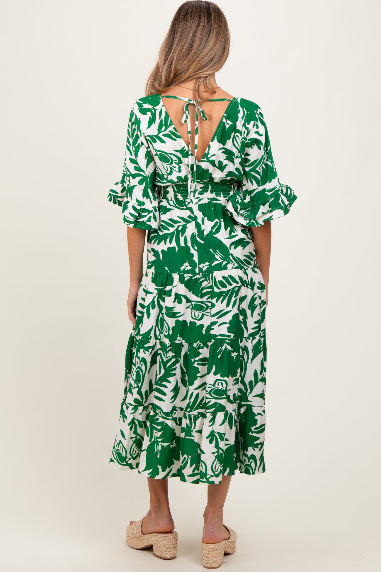 Green Abstract Floral V-Neck Tiered Maternity Midi Dress