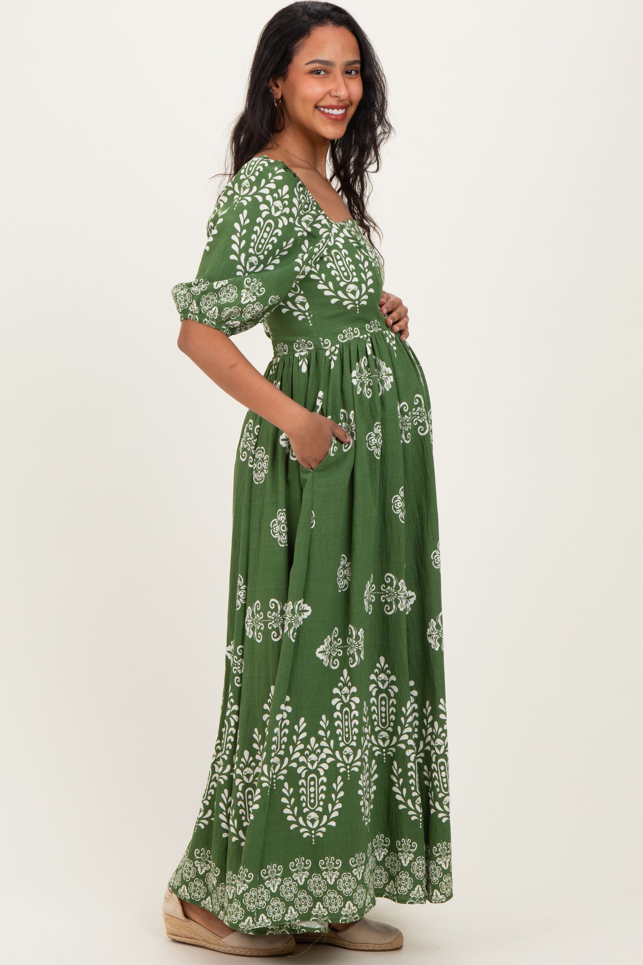 Green Damask Print Short Sleeve Maternity Maxi Dress