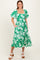 Green Floral Scallop Trim Puff Sleeve Midi Dress