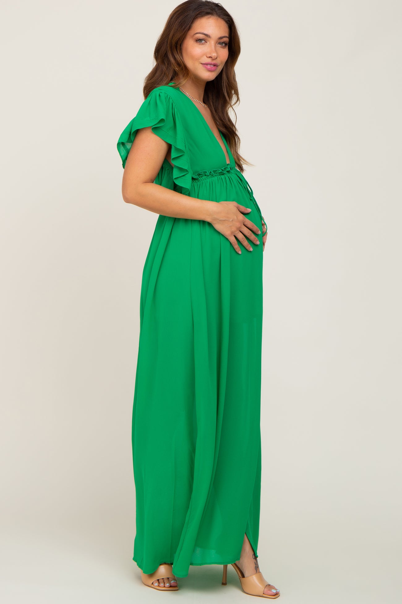 A chiffon maternity maxi dress with a deep v-neckline, sort flounce sleeves, a drawstring ruffle accent waist, and functioning front buttons at the skirt. Dress is partially lined to prevent sheerness.