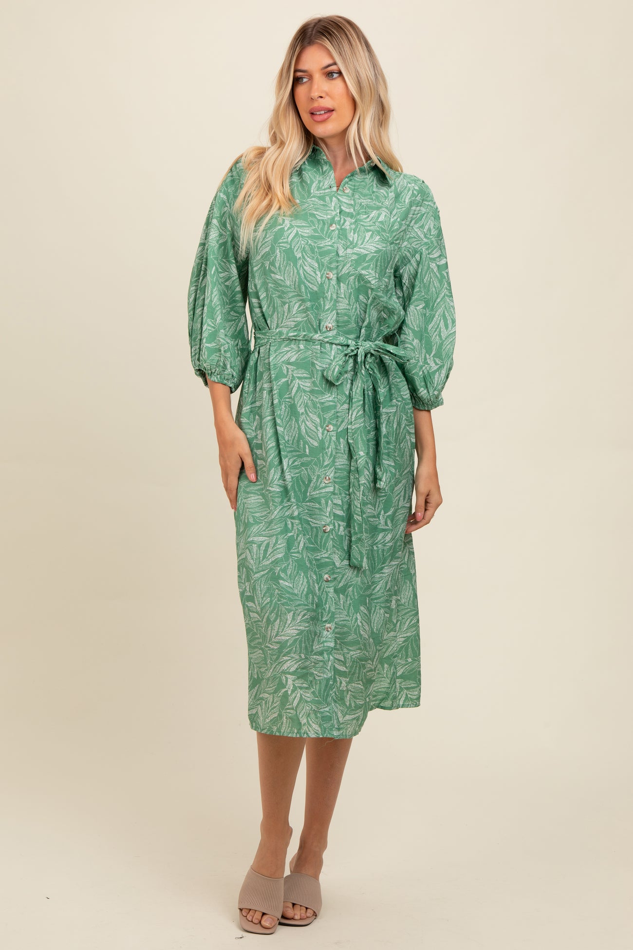 Green Mocha Leaf Print Button Down Front Tie Midi Dress
