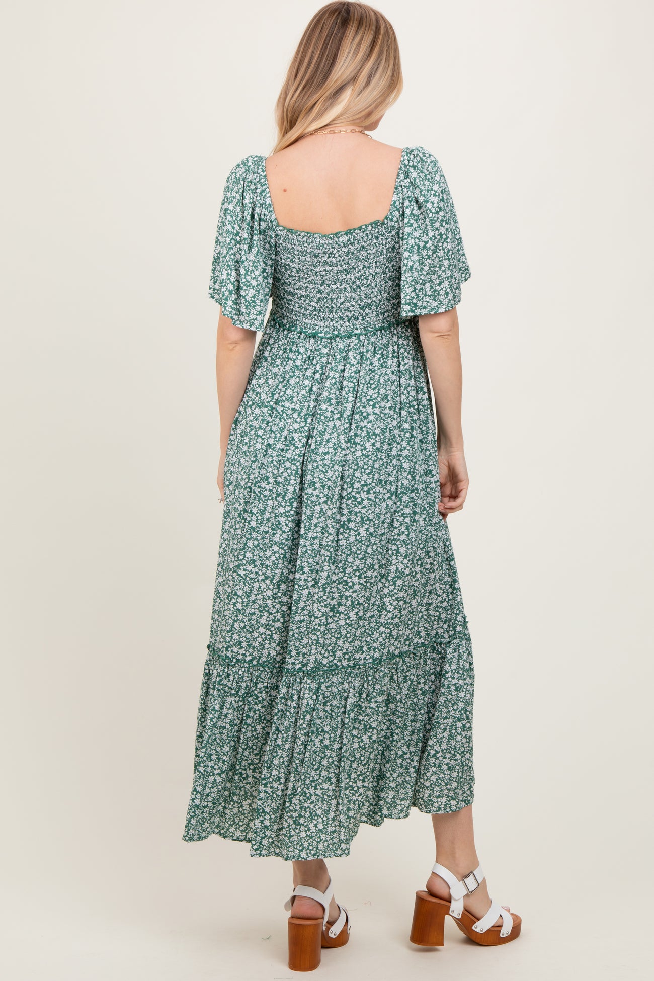 Green Smocked Button Down Flutter Sleeve Maxi Dress
