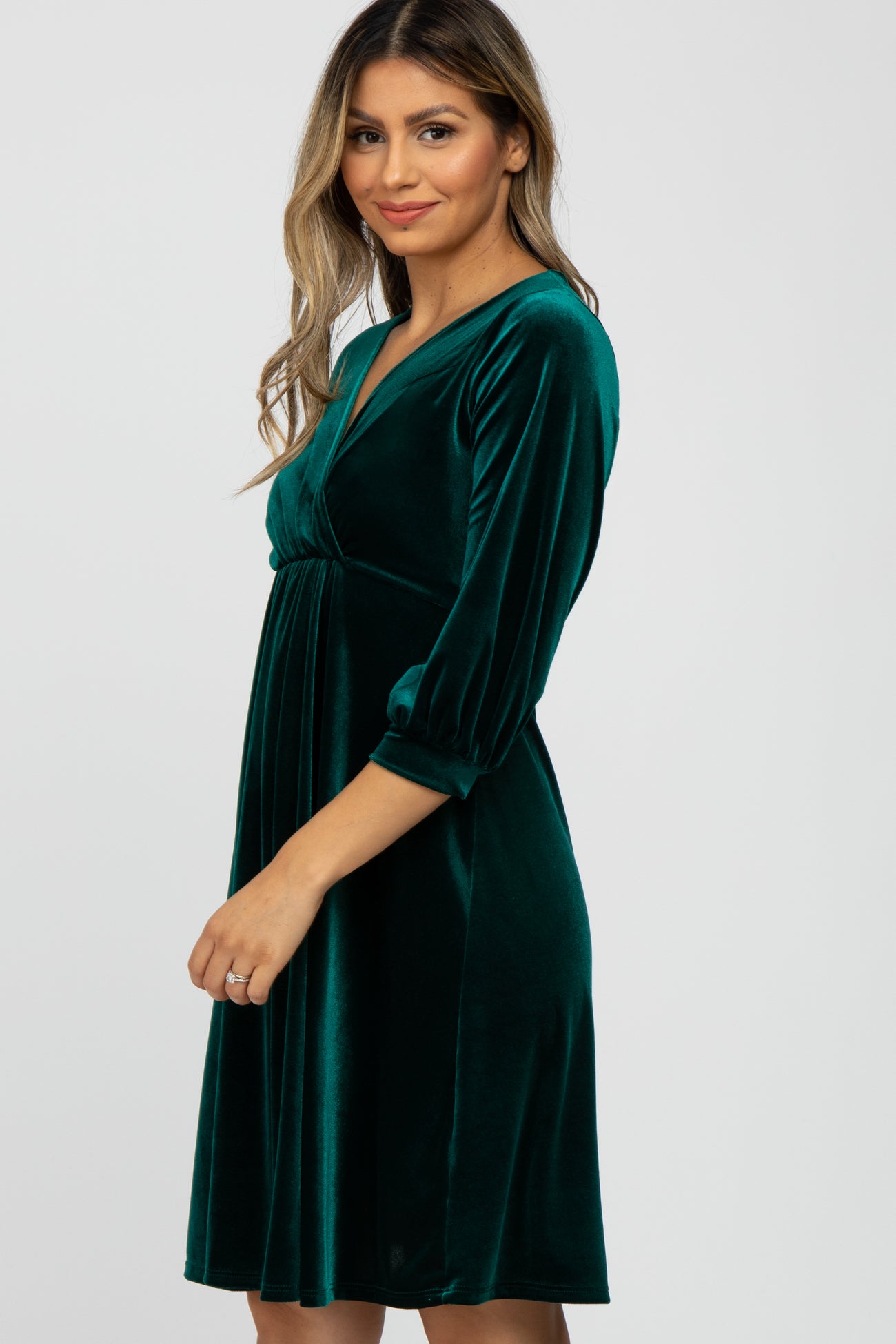 A velvet dress featuring a wrap front v-neckline, 3/4 length sleeves and a pleated empire waist.