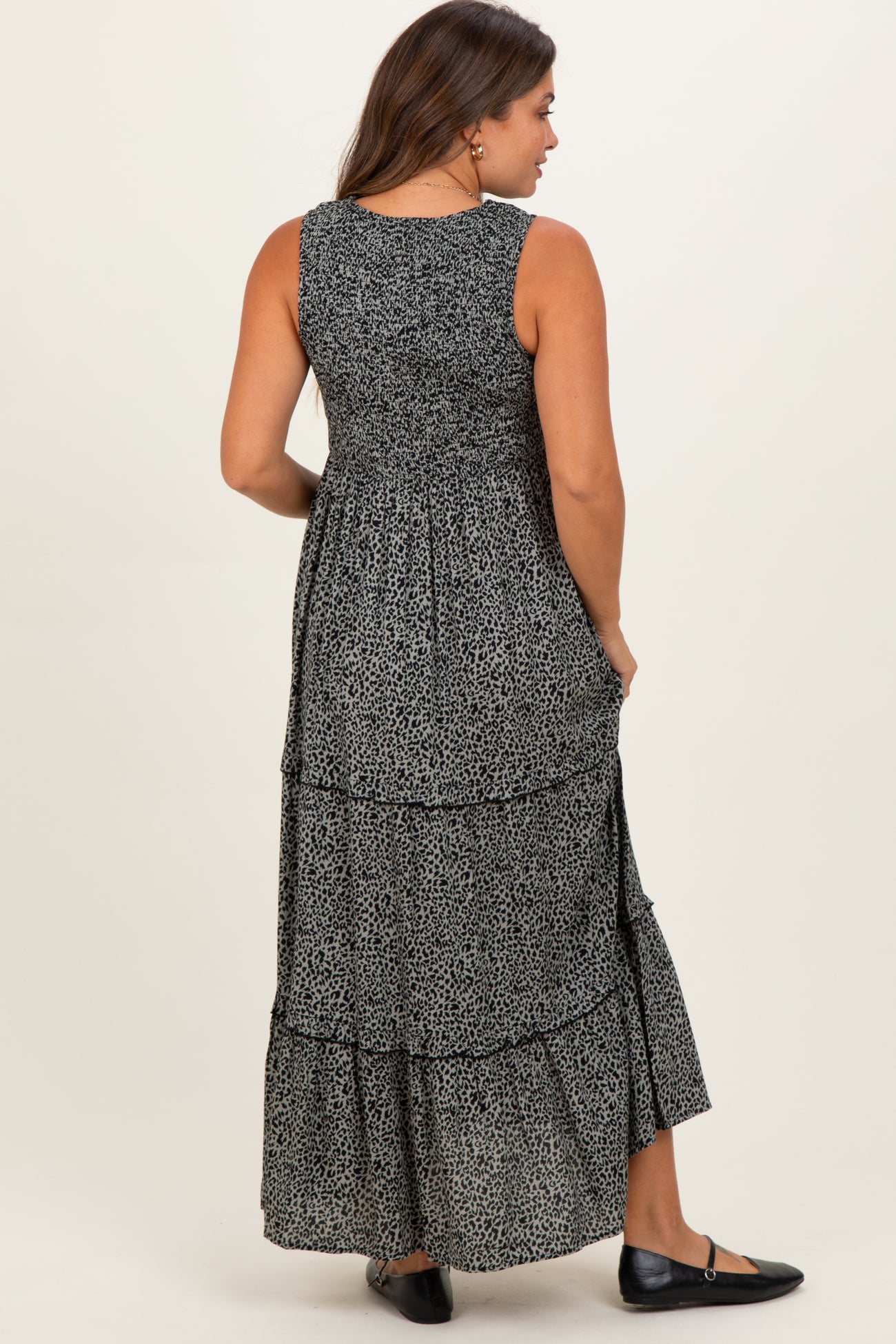 Embrace effortless style and comfort with our Grey Animal Print Sleeveless Smocked Tiered Maternity Maxi Dress. Designed with a stretchy smocked bodice, this dress perfectly adapts to your growing bump while offering a flattering fit. The sleeveless cut keeps you cool, and the subtle grey animal print adds a trendy touch. Featuring a breezy tiered skirt for an elegant, flowing silhouette, this maxi dress is ideal for any occasion—from casual outings to special events. Pair it with sandals or flats for a chic maternity look you'll love to wear all season long. Perfect for pregnancy and beyond!