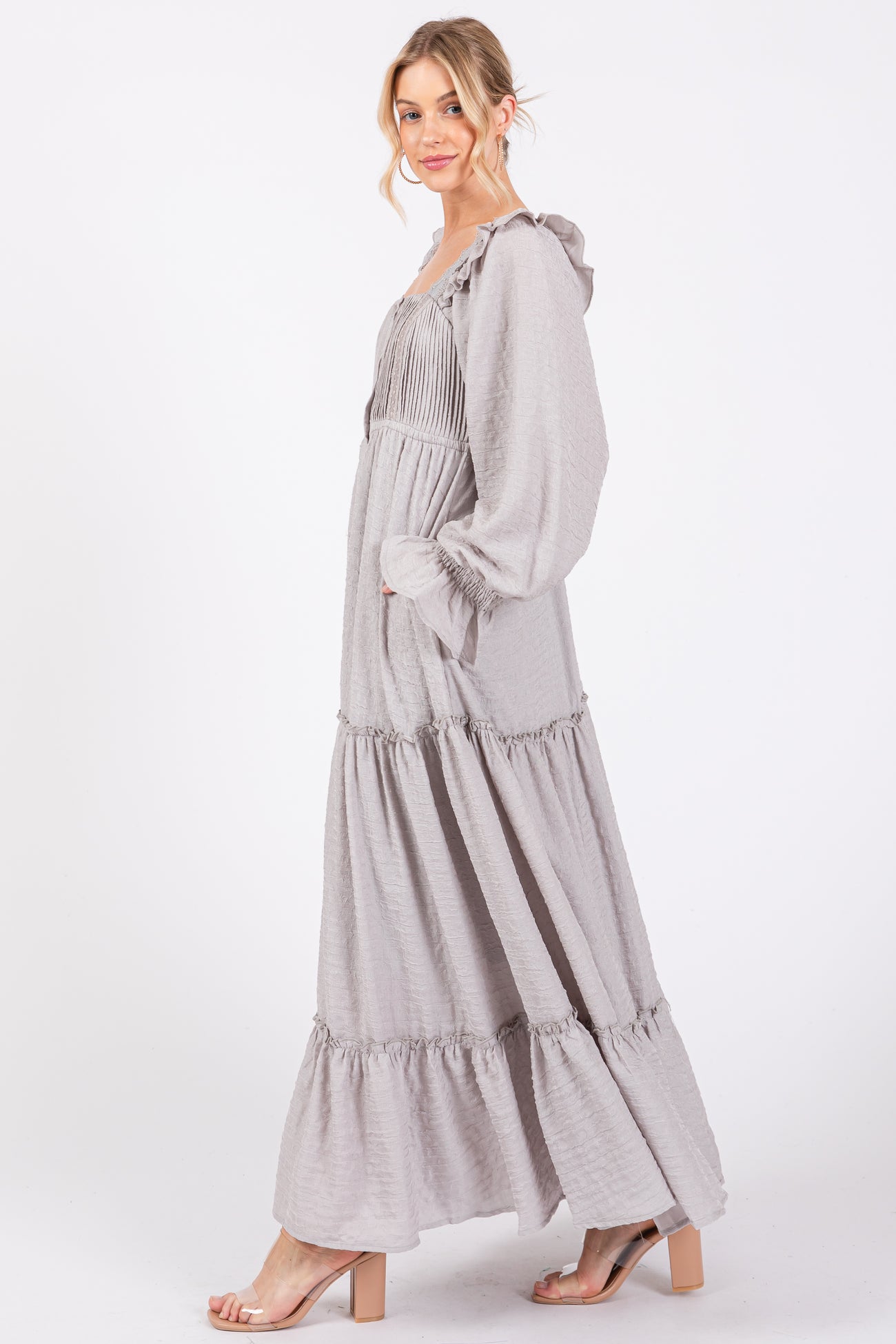 Grey Button Pleated Front Square Neck Ruffle Tiered Maxi Dress