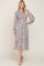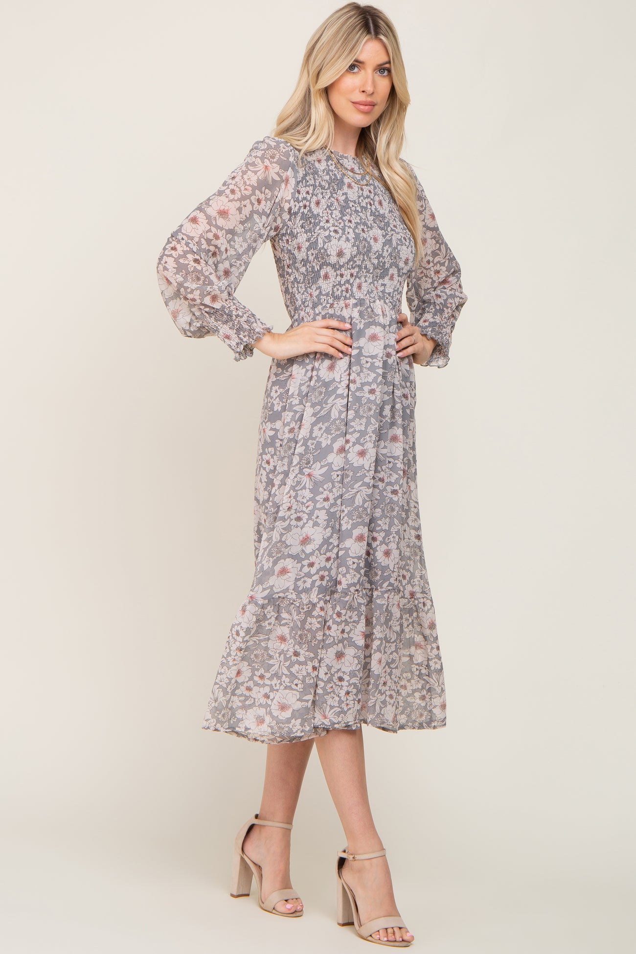 Grey Floral Smocked Long Sleeve Maxi Dress
