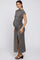 A glitter effect maternity midi dress with a mock neckline, short capped sleeves, a ruched side, and a side slit. Dress is fully lined.