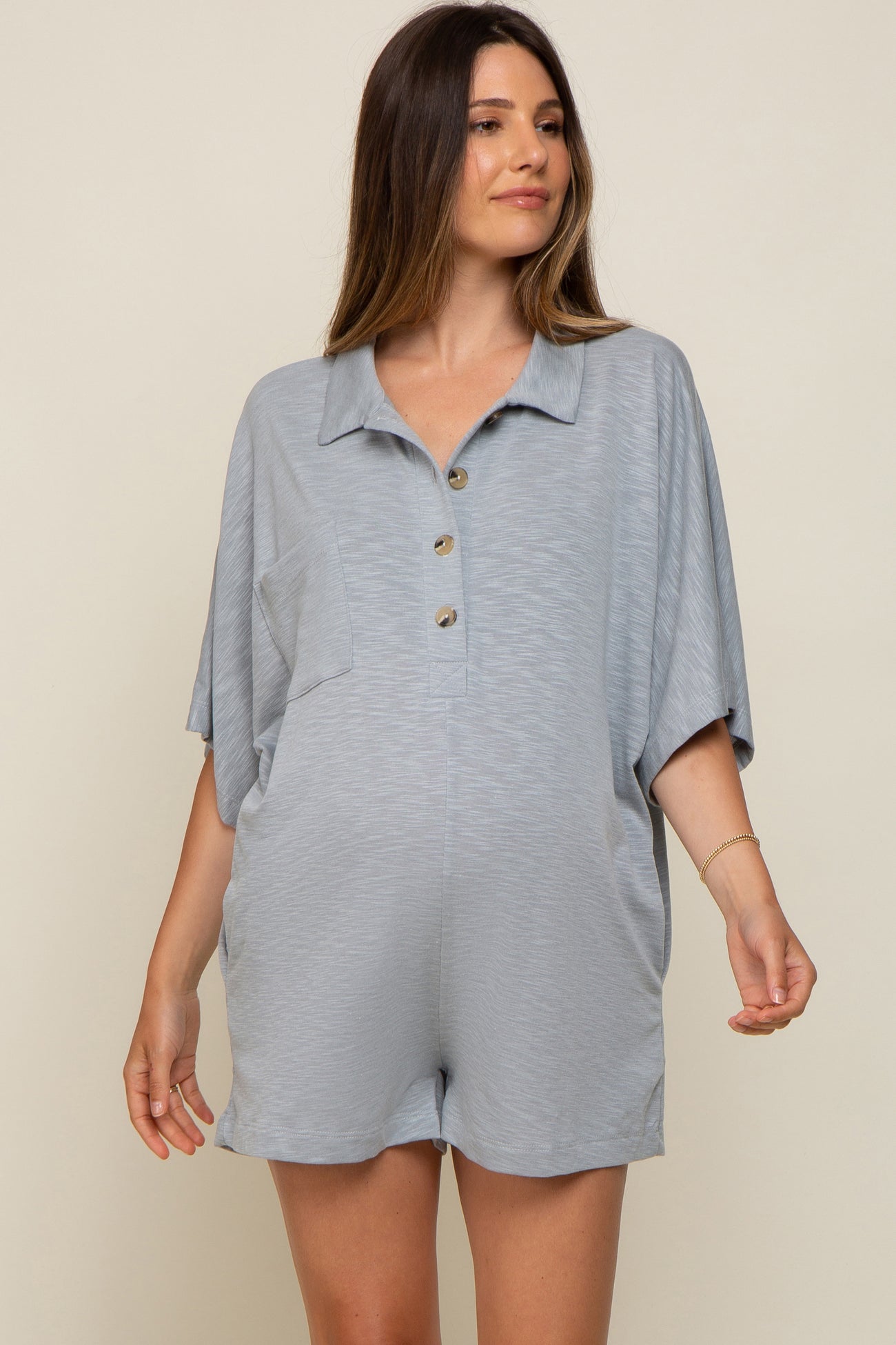 Details A heathered maternity romper with a collar, front functioning buttons, a front pocket, short dolman sleeves, and side pockets. Content + Care