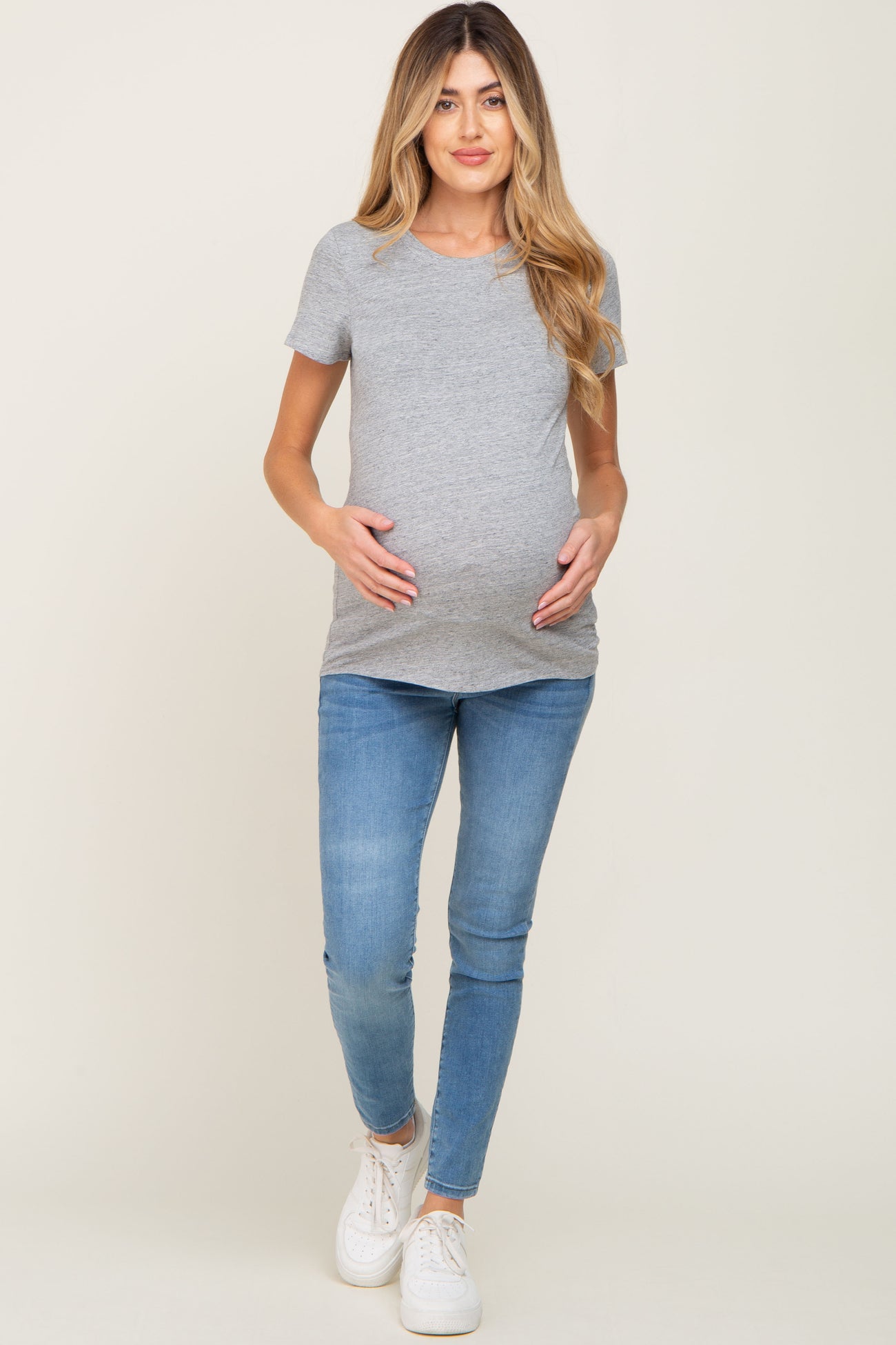 Elevate your everyday style with our Basic Crew Neck Maternity Tee. Crafted from ultra-soft, stretchy fabric, this tee effortlessly adapts to your growing bump, delivering all-day comfort and a flattering fit at every stage of pregnancy. The classic crew neck and short sleeves make it easy to layer or wear solo, while the versatile shade pairs perfectly with any outfit. Dress it up with a blazer or keep it casual with your favorite jeans—this maternity essential is perfect for lounging, running errands, or casual outings. Look and feel your best with this must-have basic!