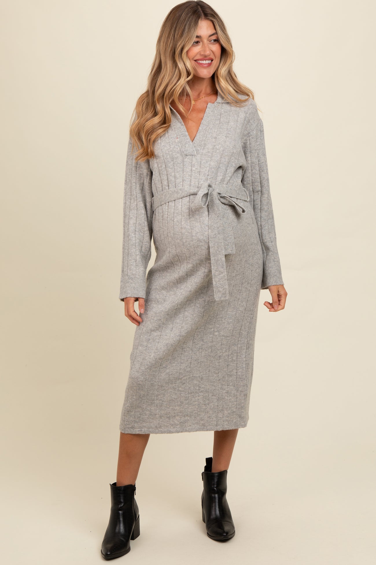 Heather Grey Ribbed Sweater Collared Maternity Midi Dress