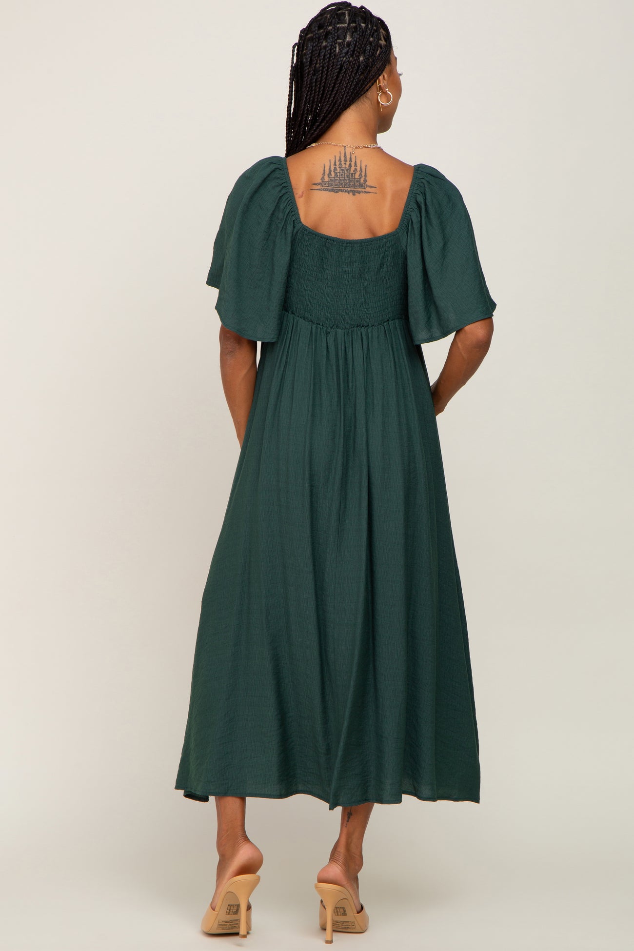 Hunter Green Front Tie Ruffle Sleeve Midi Dress