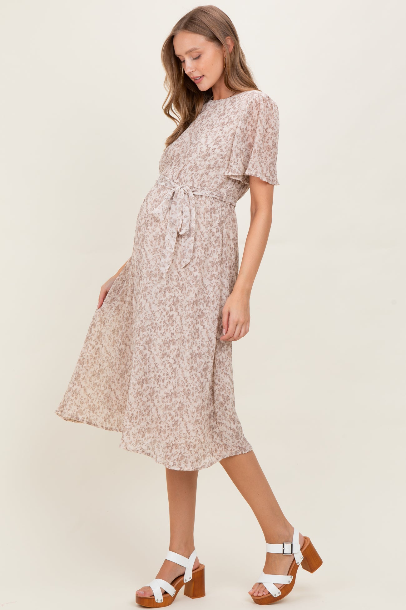 Ivory Floral Plisse Chiffon Maternity Midi Dress