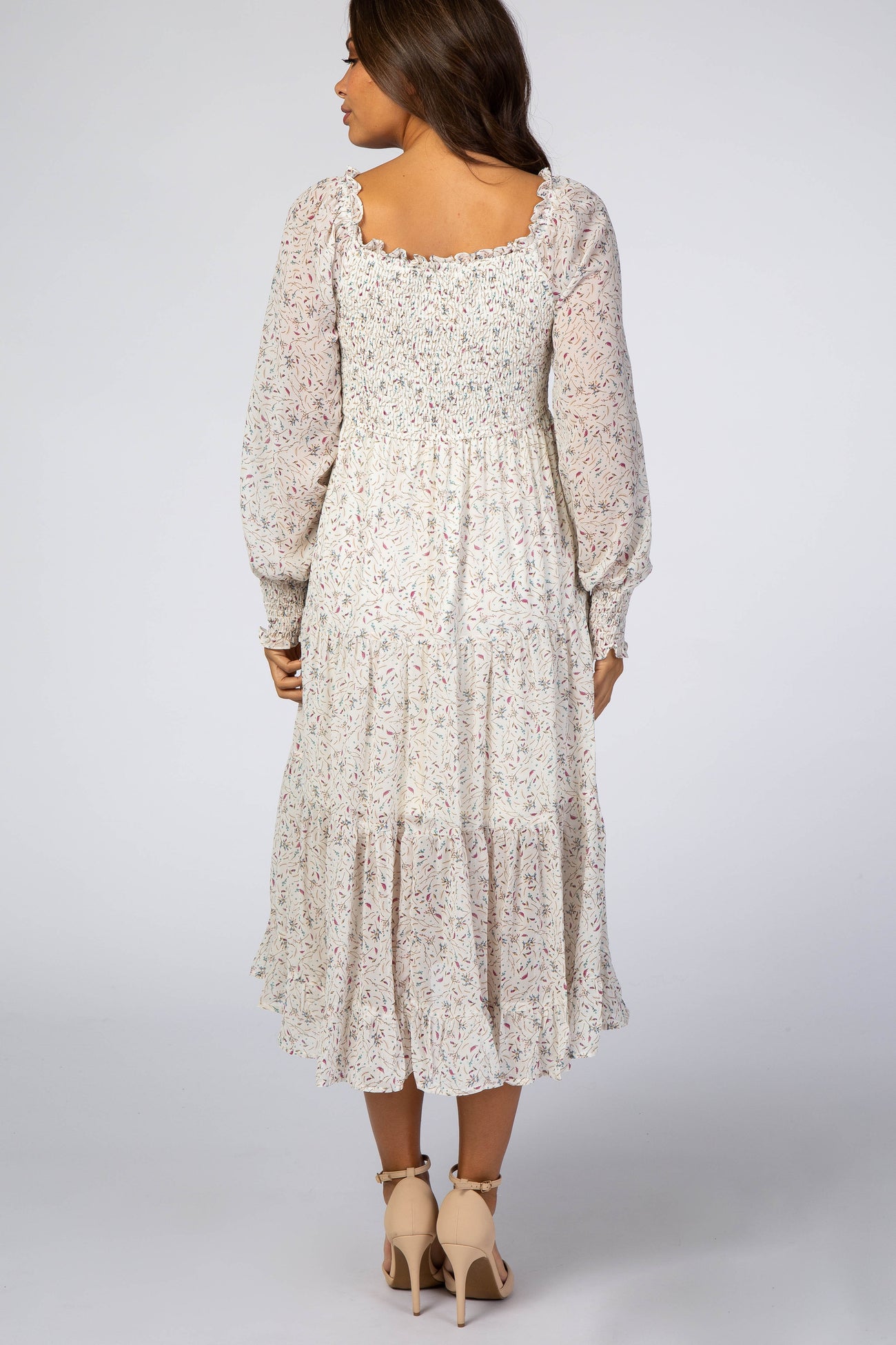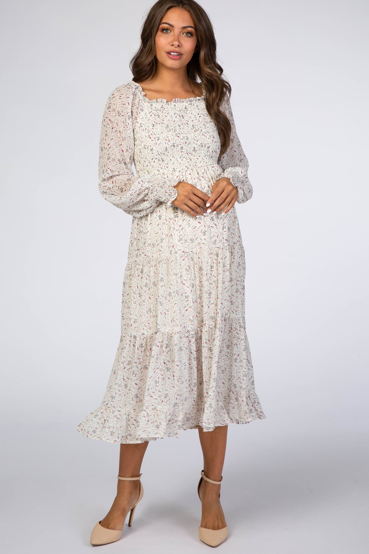 Ivory Floral Smocked Front Ruffle Hem Maternity Midi Dress