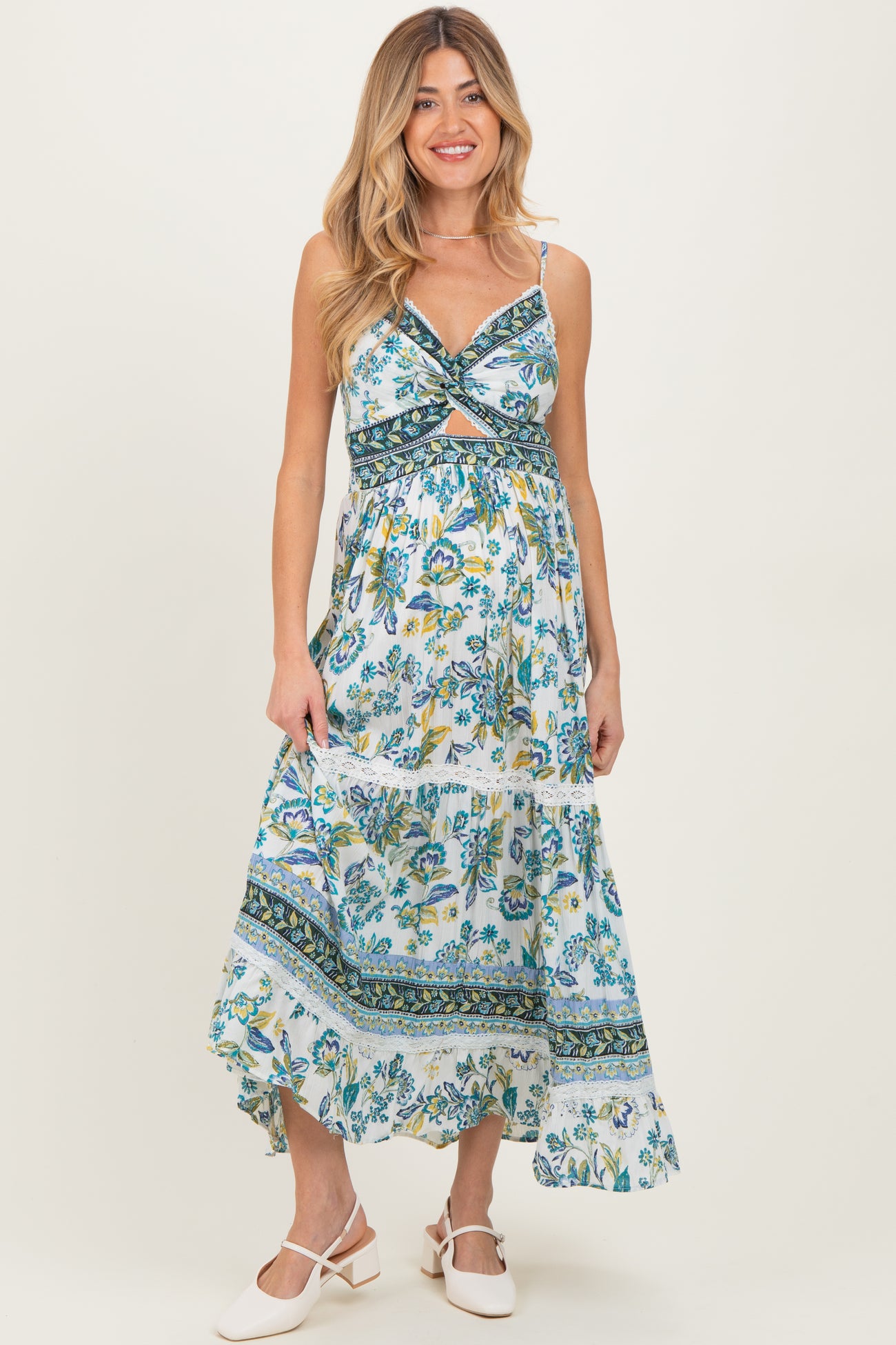 Embrace effortless elegance with this floral maternity maxi dress, designed for comfort and style throughout your pregnancy. Featuring a flattering twisted front with a subtle cutout, it enhances your natural silhouette while providing room for your growing bump. Delicate lace detailing adds a touch of romance, making it perfect for both casual outings and special occasions. Adjustable spaghetti straps ensure a custom fit, while the tiered skirt flows beautifully to keep you comfortable and chic all day long. Crafted from lightweight, breathable fabric, this dress is an essential addition to your maternity wardrobe.