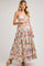 A multi-color floral maternity maxi dress featuring self-tie shoulder straps, a smocked top, side pockets, a tiered skirt and a ruffle sweetheart neckline.