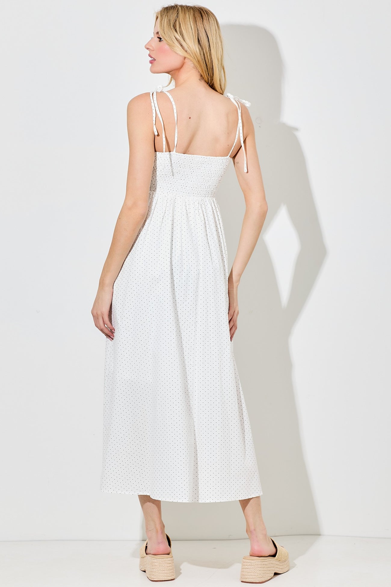 Ivory Polka Dot Shoulder Tie Midi Dress