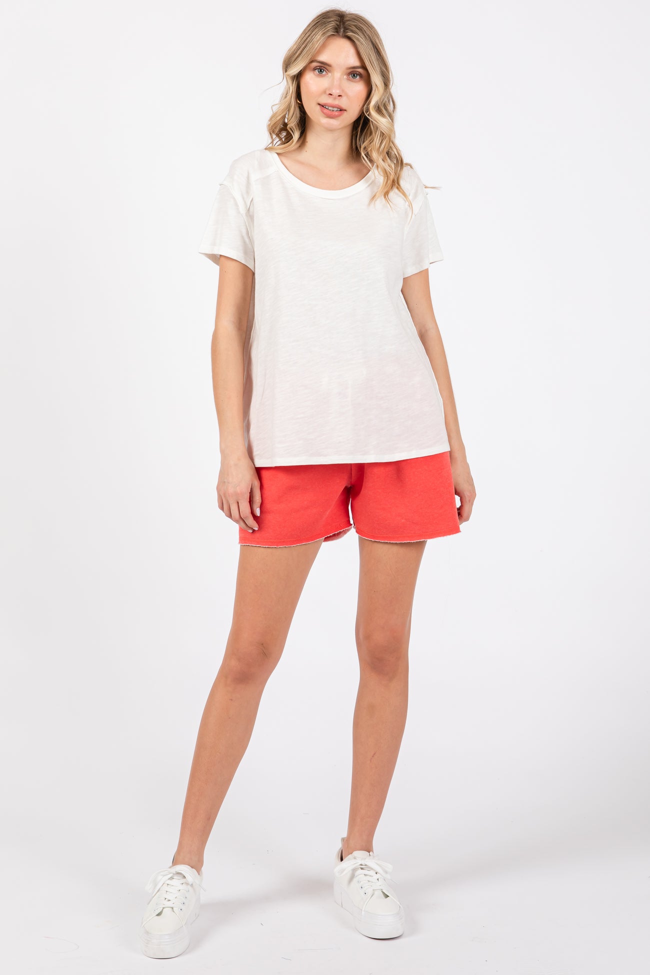 A solid basic short sleeve tee with raw hem detail and boxy fit.