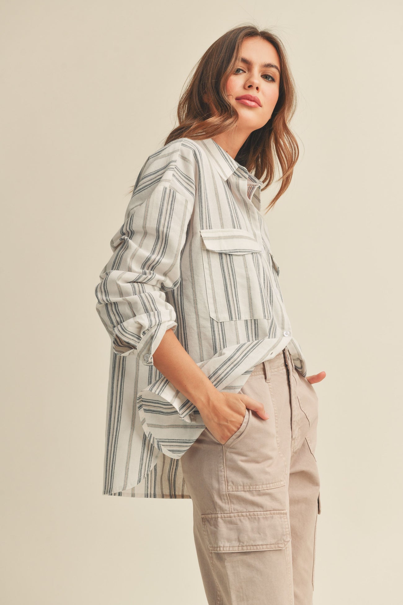 Details A striped top with a collar, front pocket with flaps, long drop shoulder sleeves, front functioning buttons, and a rounded hem. Content + Care