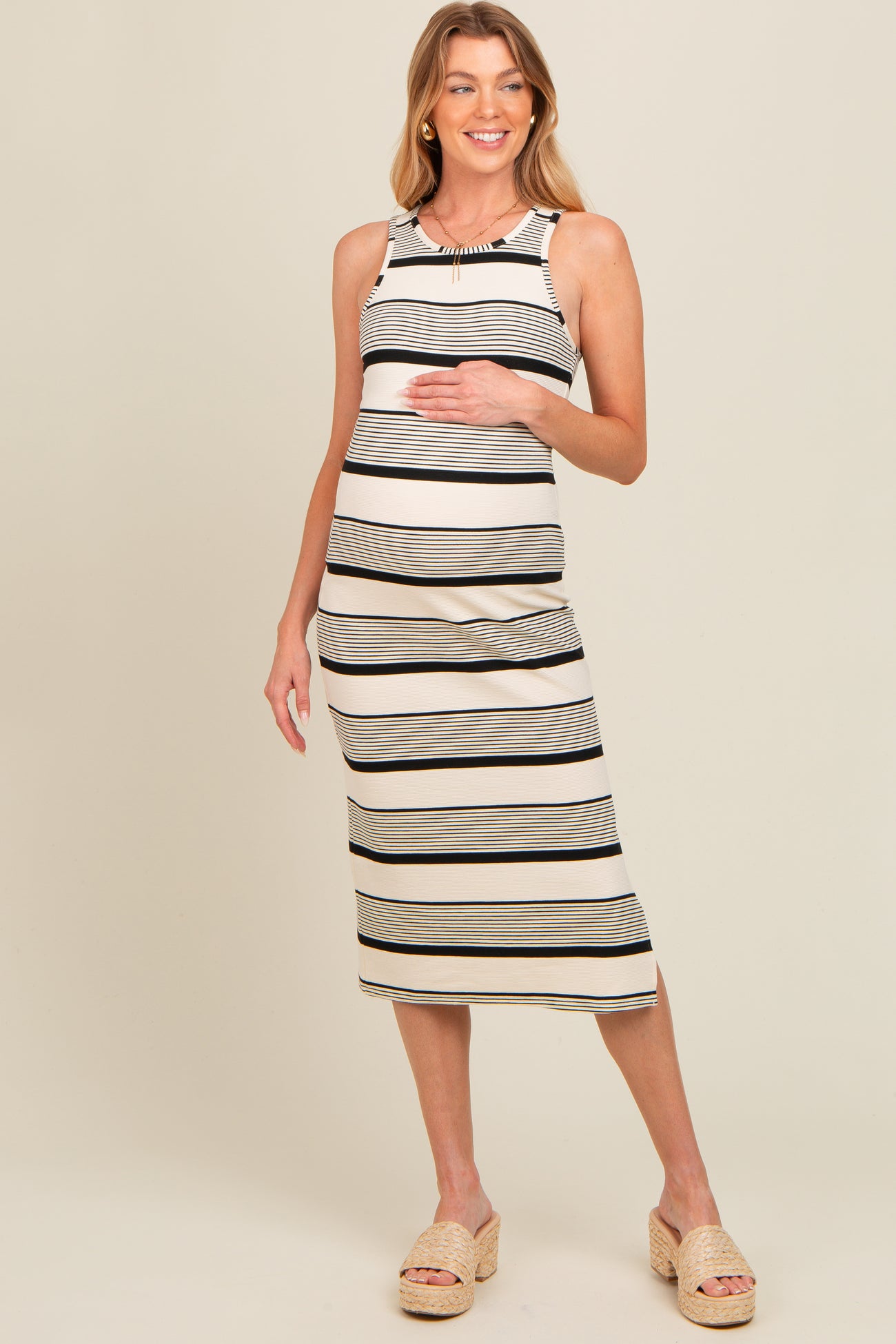Ivory Striped Sleeveless Maternity Midi Dress