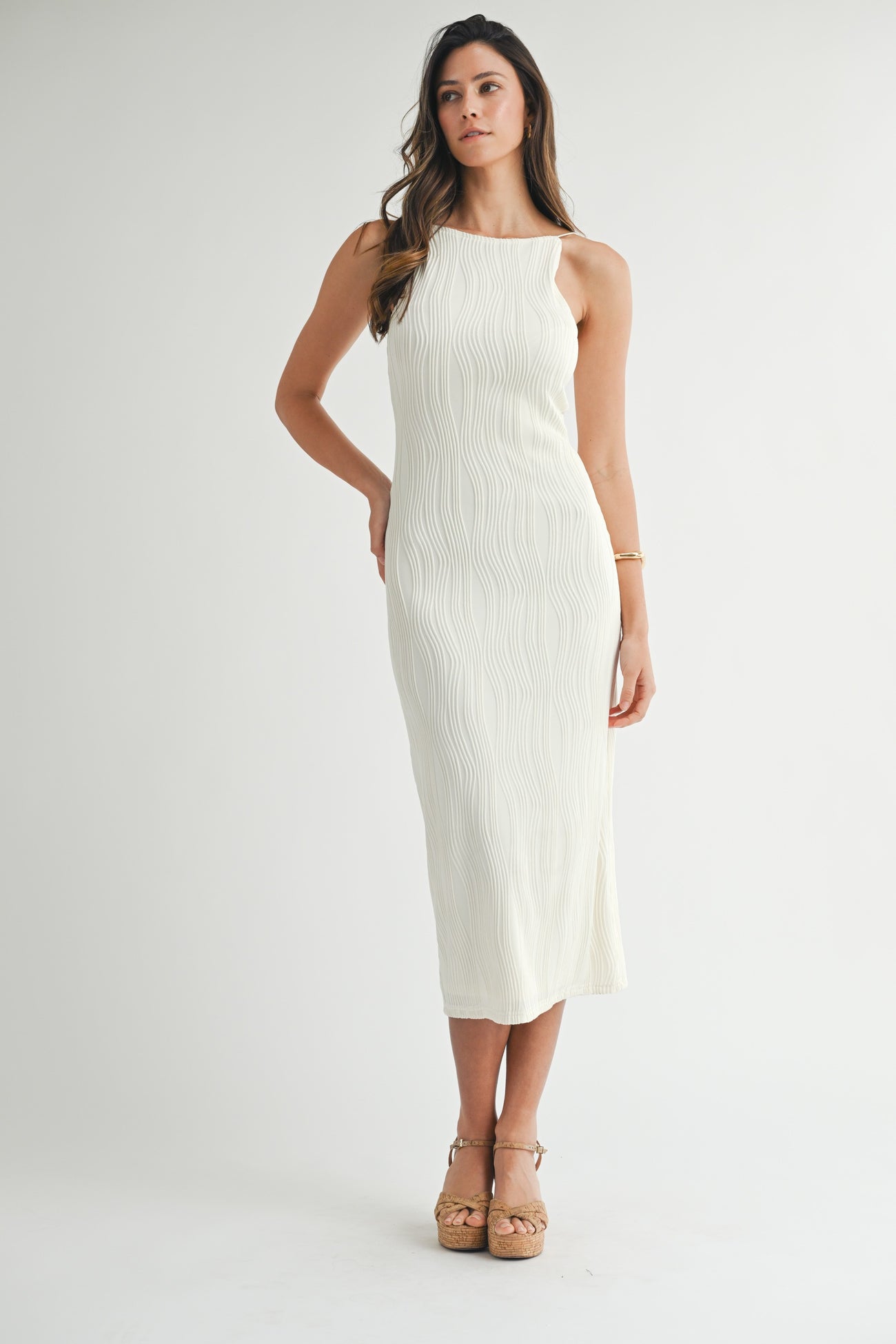 Elevate your wardrobe with this textured sleeveless fitted midi dress, designed to flatter every curve. The subtle wave pattern adds dimension and sophistication, making it perfect for both casual and formal occasions. Its midi length offers a chic silhouette, while the sleeveless cut keeps you cool and stylish. Crafted from stretch fabric for comfort and ease of movement, this dress is a versatile choice for your next brunch, date night, or special event. Pair it with your favorite heels or sandals and minimal accessories for an effortlessly elegant look.