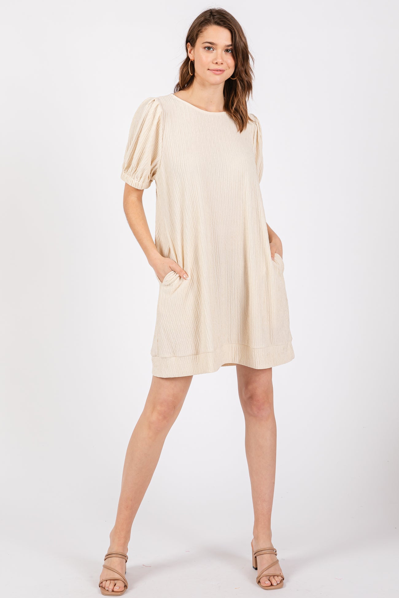 A textured stripe knit maternity dress featuring a rounded neckline, short puff sleeves with elastic bands and side pockets.