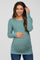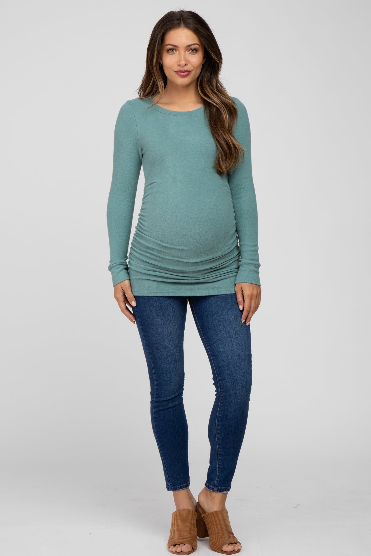 A solid brushed knit maternity long sleeve top with a scoop neckline and ruched sides.
