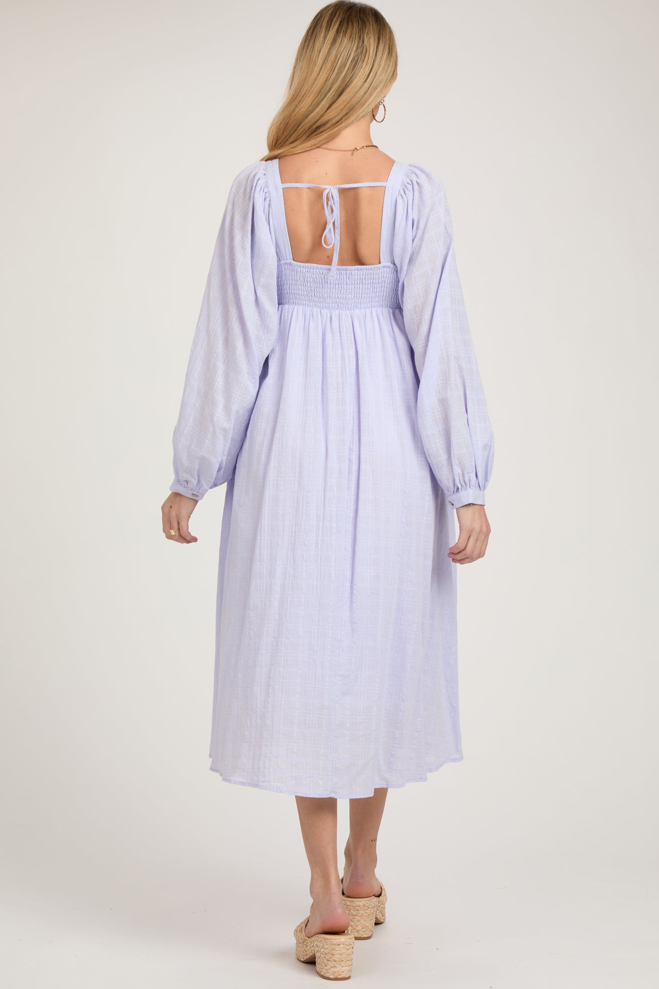 A plaid textured maternity midi dress featuring a square neckline, a criss cross front, a smocked back, long puff sleeves, an empire waist and double lining.
