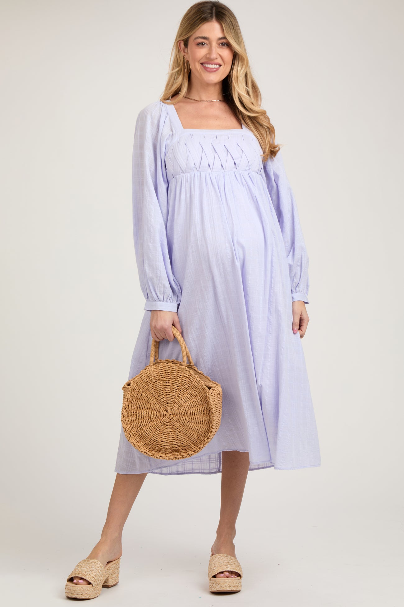 Lavender Criss Cross Front Square Neck Long Sleeve Maternity Midi Dress