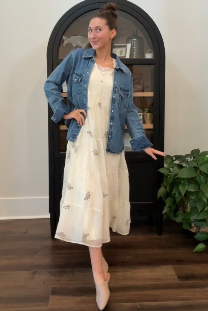 Step into effortless charm with our Lavender Ditsy Floral Embroidered V Neck Tiered Dress. Crafted from lightweight, breathable fabric, this dress features delicate lavender floral embroidery scattered across a soft, cream backdrop. The flattering V neckline and sleeveless design provide a breezy feel perfect for warm days. Its tiered silhouette adds subtle volume and movement, creating a graceful, feminine look. Whether you're heading to a garden party or a casual brunch, pair it with sandals or wedges for a fresh, stylish statement. Embrace the essence of summer with this must-have dress!