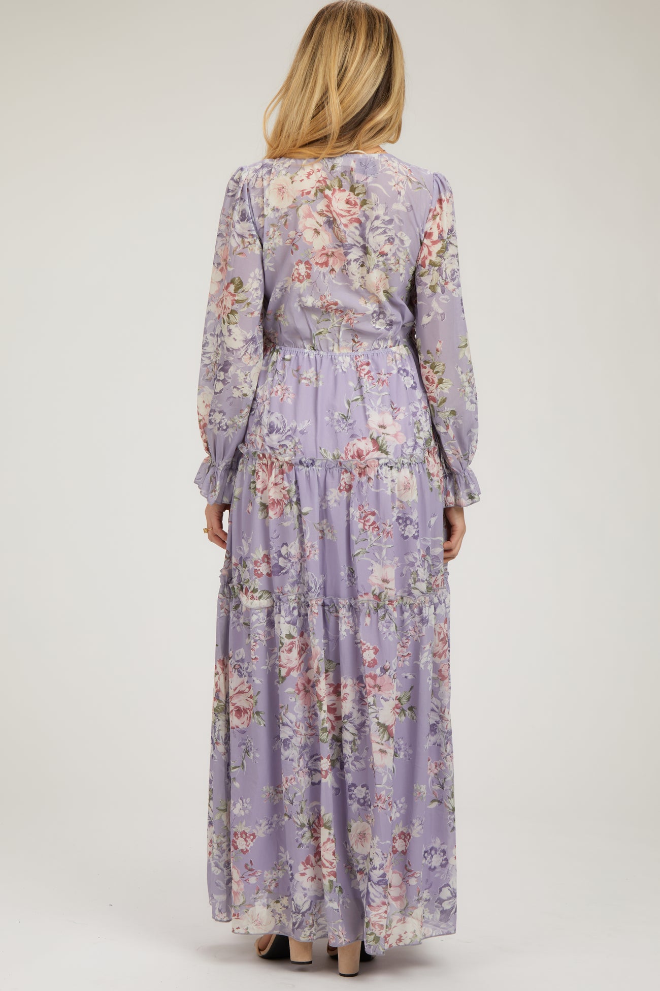 Lavender Floral Chiffon Deep V Ruffle Tiered Maternity Maxi Dress