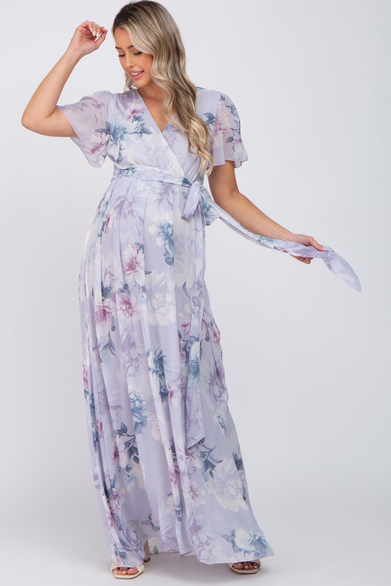 Lavender Floral Chiffon Wrap Front Short Sleeve Maternity Maxi Dress